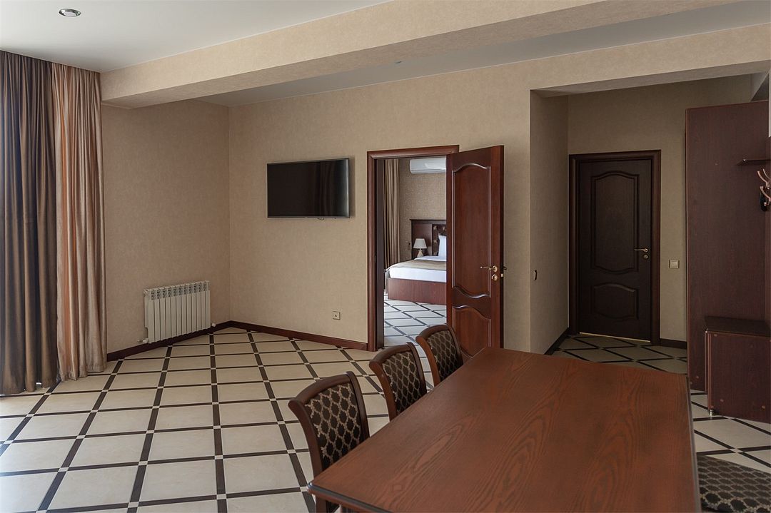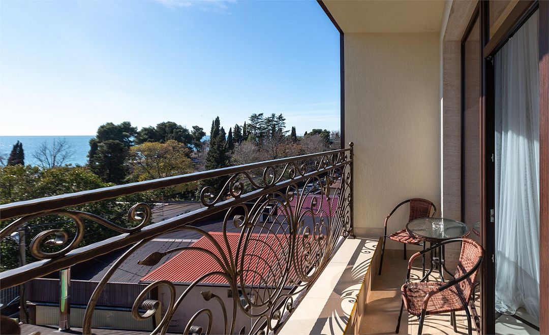 Апартаменты с видом на море, кухней и большим балконом. Номер с большой двухспальной кроватью с ортопедическим матрасом, креслом и шкафом-купе. В числе удобств - гостиная с раскладным диваном, кондиционером, феном, холодильником и посудой. В номере реверсивное освещение, электронные замки. Собственная ванная комната с душем и сушилкой для белья укомплектована туалетно-косметическими принадлежностями, полотенцами, халатами и тапочками. В номере можно организовать размещение на дополнительных местах.Услуги и удобства