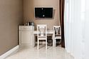 Номер предполагает комфортное размещение гостей с современным дизайном и качественной мебелью, изготовленной по индивидуальному дизайну. Номер оснащен современными удобствами, включая LCD-телевизор с функций web OS, мини-холодильник, система климат-контроля, чайная станция, набор необходимой посуды. Ванная комната укомплектована набором полотенец, косметическими принадлежностями, феном, халатами и тапочками.Услуги и удобства
