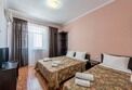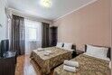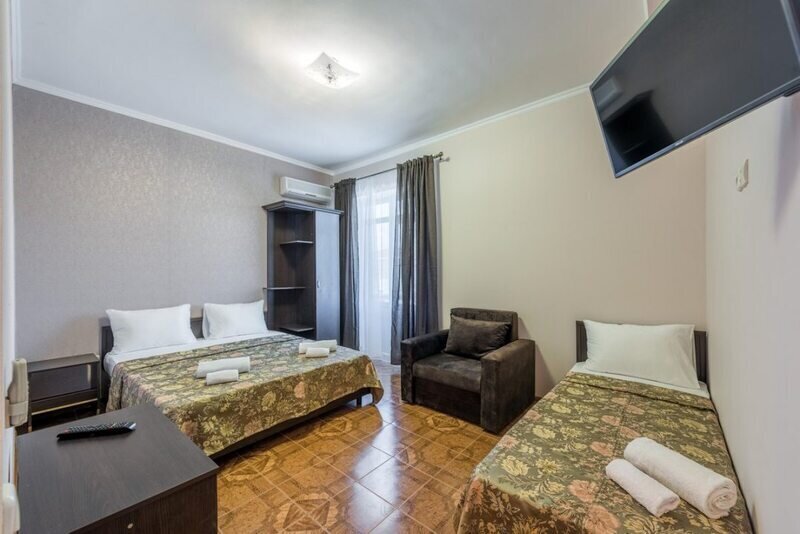 В номере одна двуспальная и одна односпальная кровати. Можно поставить дополнительное место — раскладное кресло. Есть сушилка для белья, на каждого гостя по 2 полотенца и постельное белье.