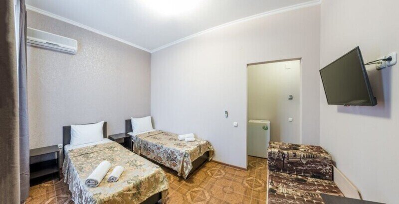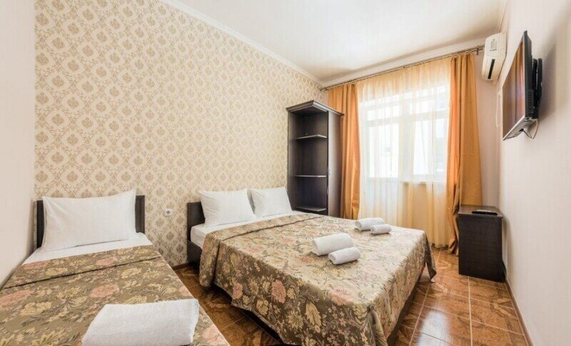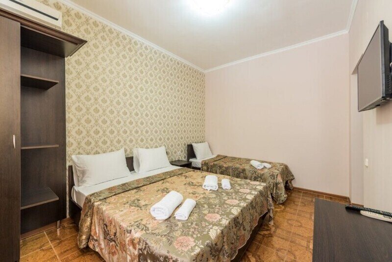 В номере одна двуспальная кровать и 2 односпальные кровати. Есть сушилка для белья, полотенца по 2 штуки на гостя, постельное белье.