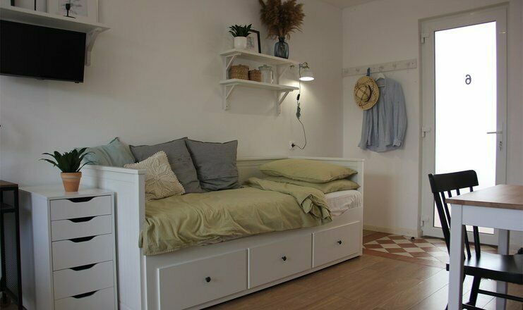 Гостям предлагаются 9 номеров-апартаментов, оформленных в светлых приятных тонах. В номерах стильный интерьер. В числе удобств: мини-кухня, сплит-система, плазменный телевизор, в ванных комнатах для отдыхающих подготовлены косметические наборы.