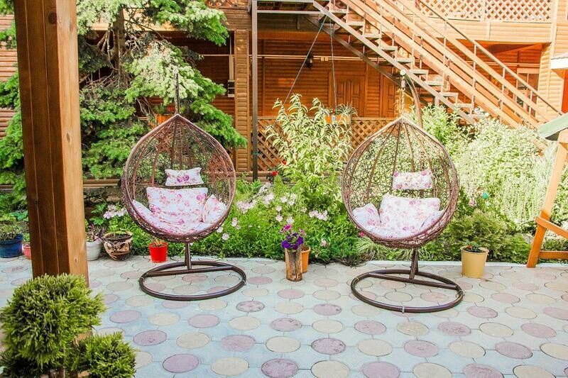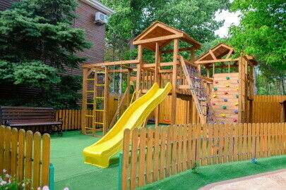 На территории имеется бассейн с детской и взрослой зоной для купания, детская площадка, уличная терраса с мебелью для отдыха. Рядом с пансионатом расположен парк аттракционов, питьевой бювет, продуктовый магазин и крытый рынок продовольственных, хозяйственных и пляжных товаров.