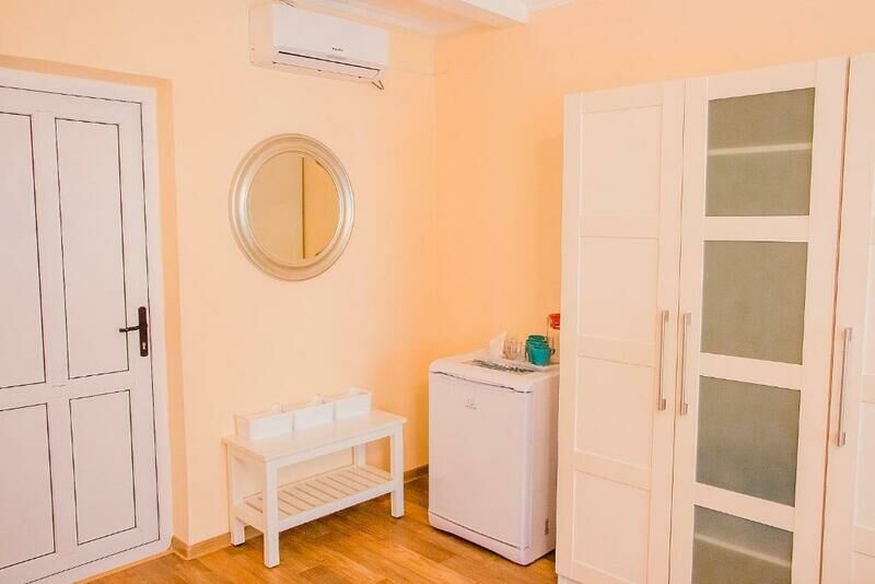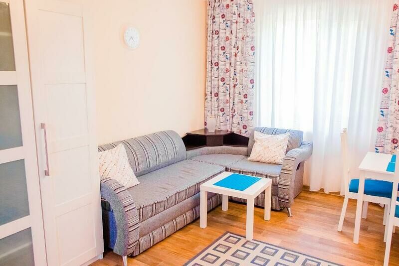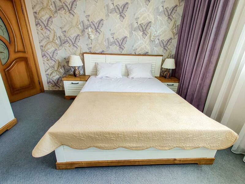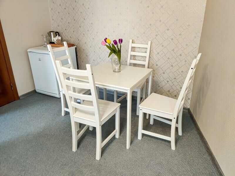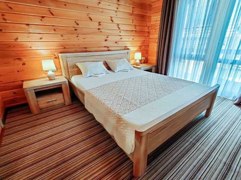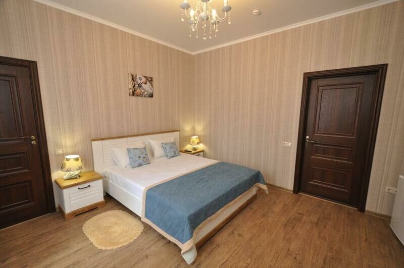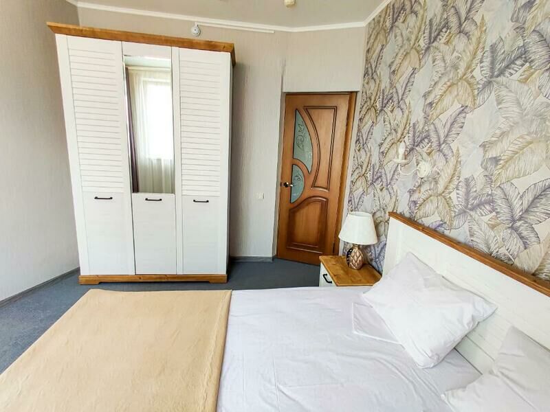 Спальня - большая двуспальная кровать. Гостиная- двуспальный раскладной диван. В Номере- обеденный стол, стулья, шкаф, холодильник, ТВ, сплит-система, сушилка для белья.