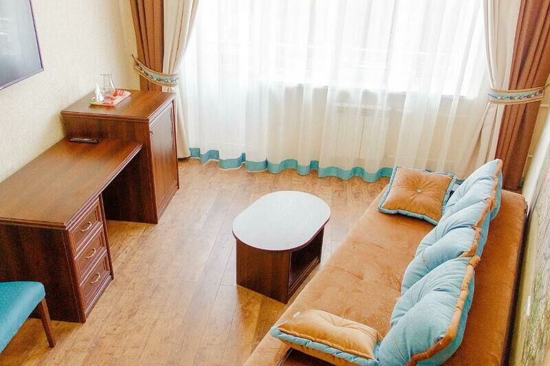 Звукоизолированный номер-студия с диваном и телевизором с плоским экраном.