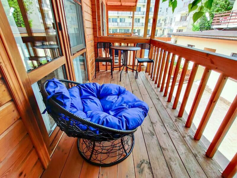 В номере: двуспальная кровать, прикроватные тумбочки, стол, пуфик, холодильник, телевизор, сплит-система, балкон с мебелью, сушилка для белья.