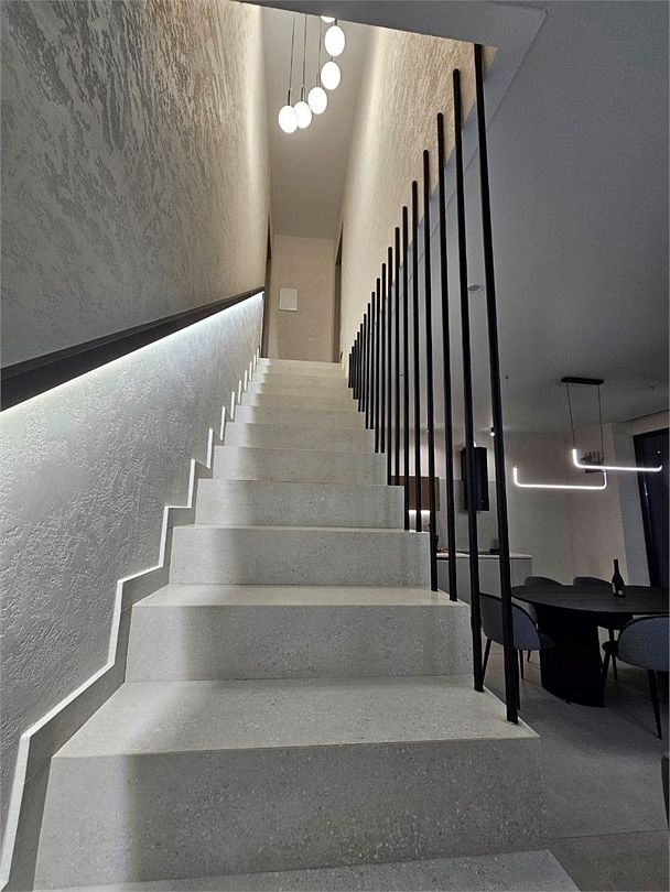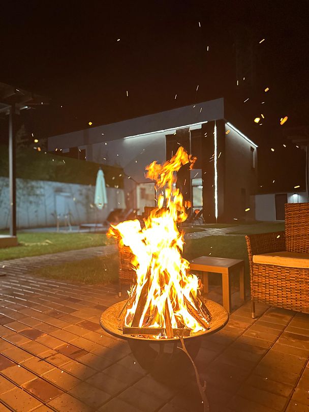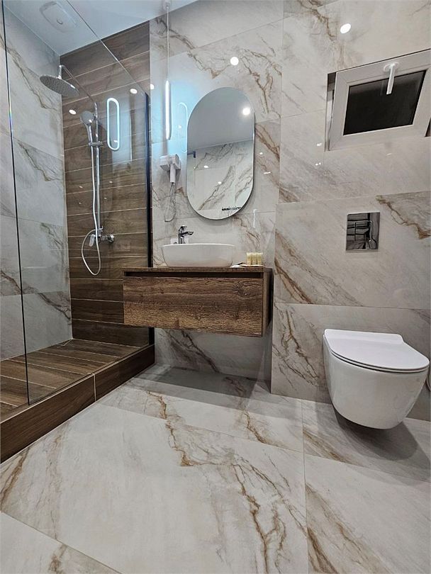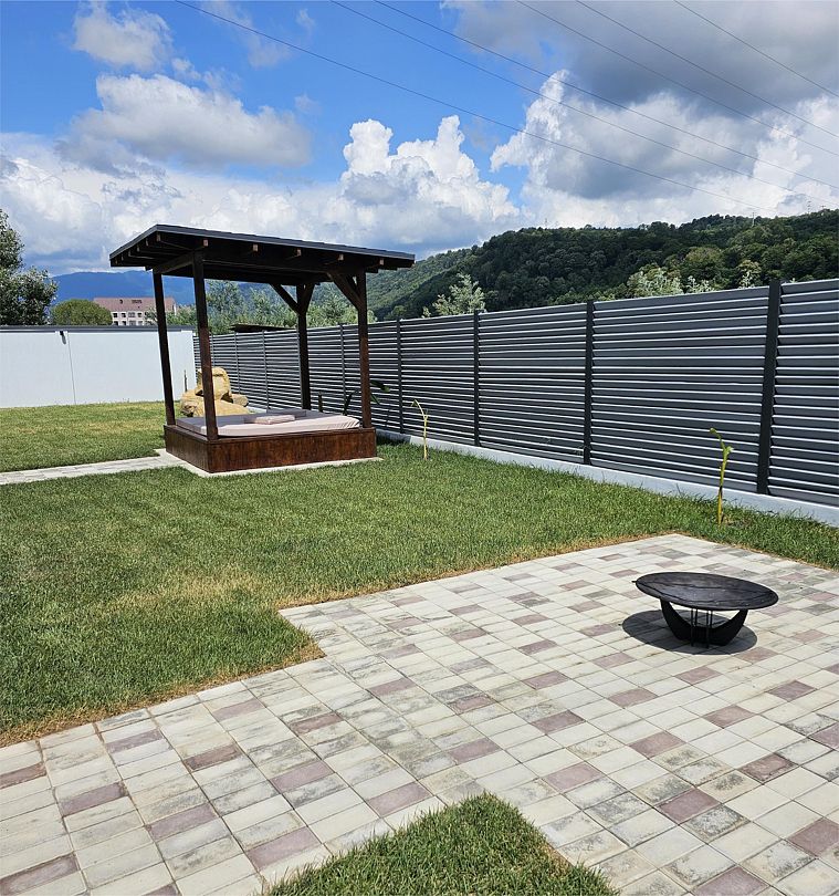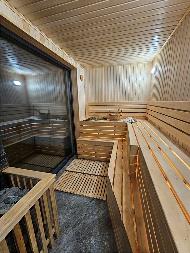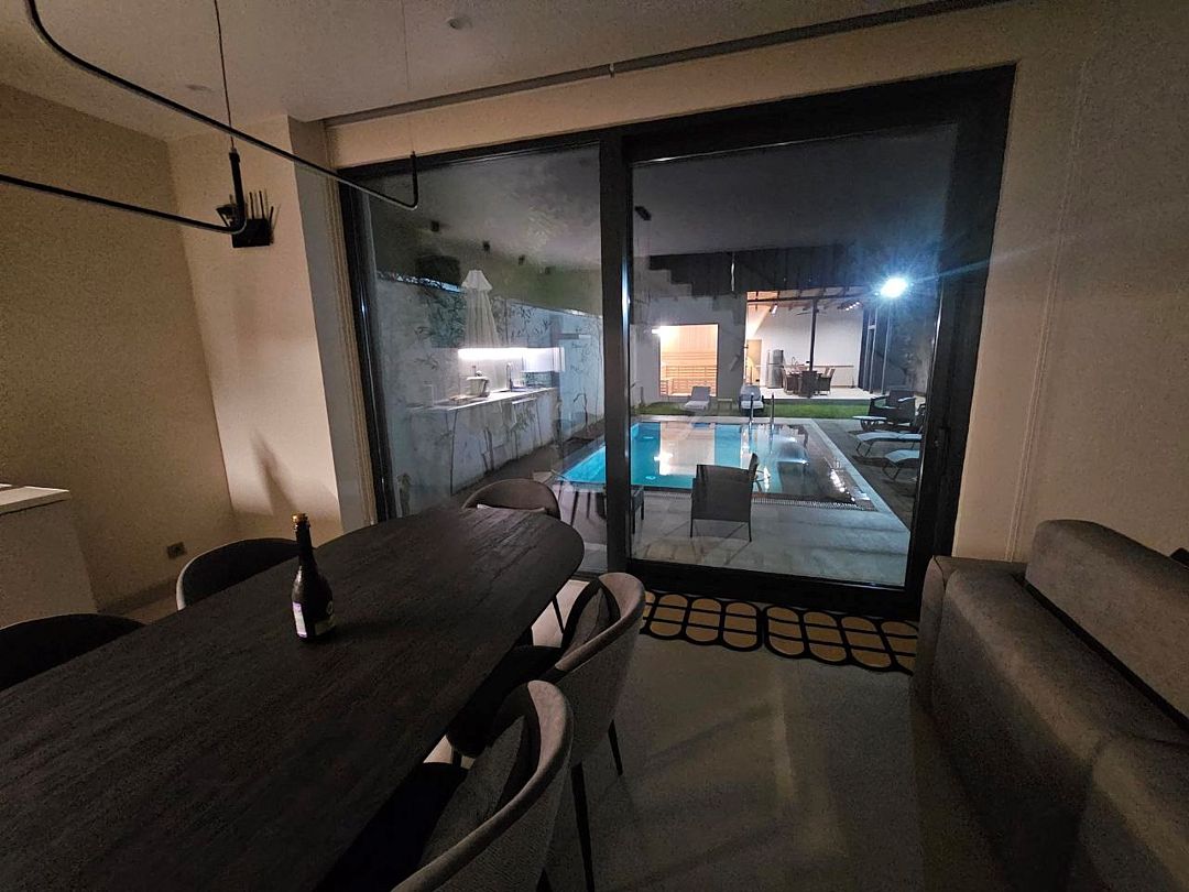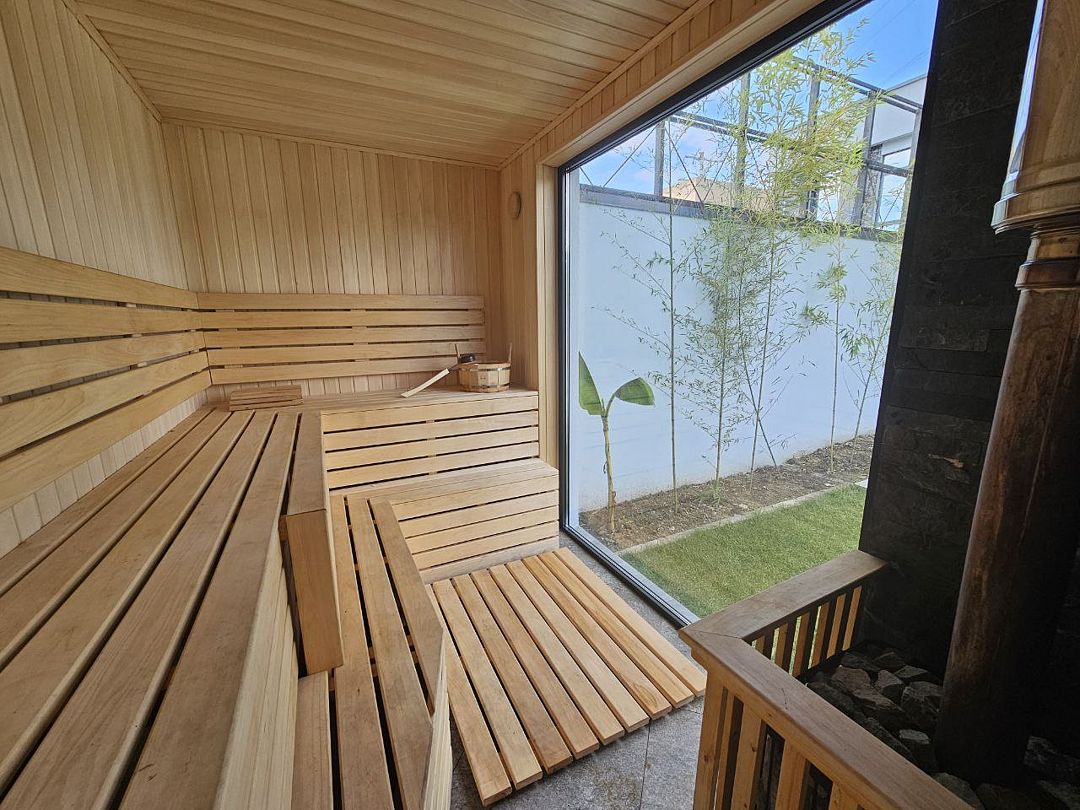 Оригинальные места для отдыха на участке, такие как бассейн с подогревом, украшенный водопадом, и русская баня с панорамными окнами, делают виллу похожей на райский уголок. Расстояние до ближайшего оборудованного галечного пляжа составляет около 6 километров.