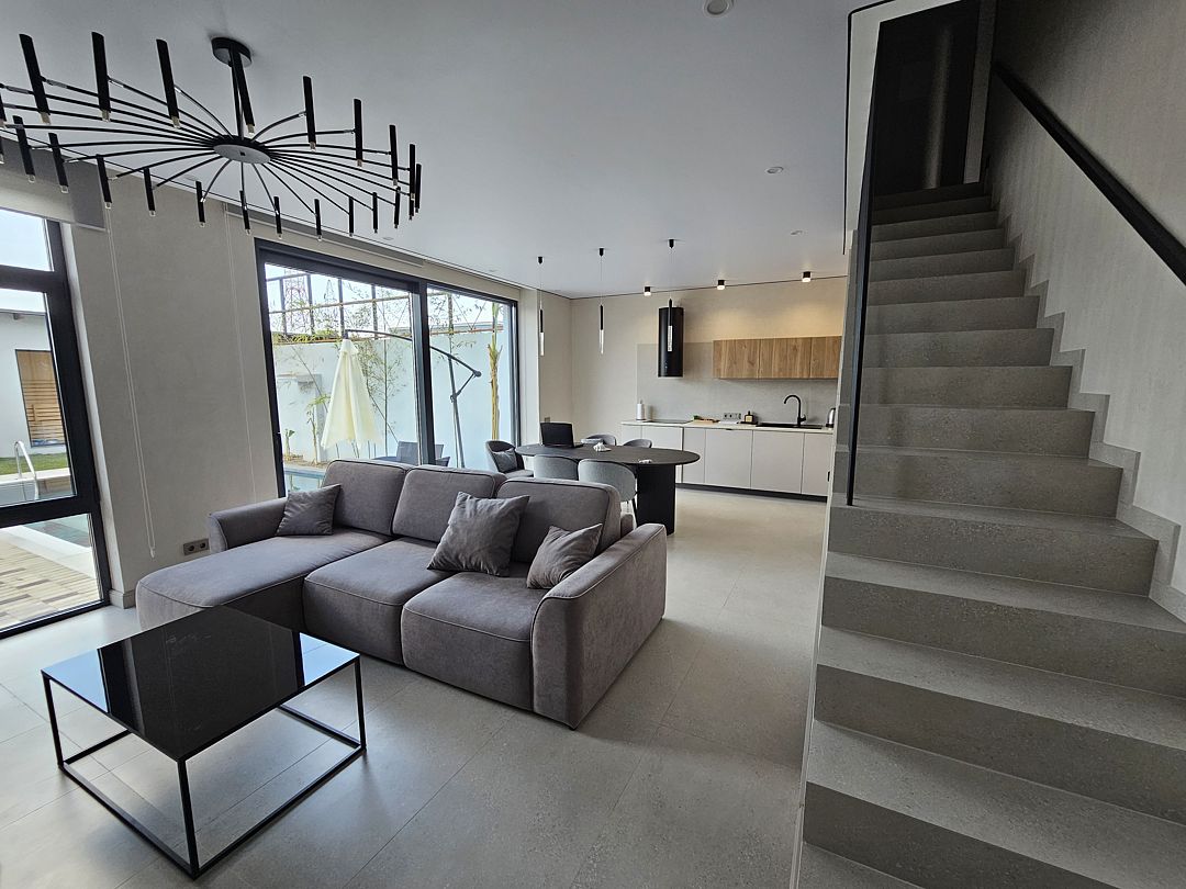 Вилла отличается продуманным дизайном, который обеспечивает комфорт и стиль. Просторные главные спальни с отдельными ванными комнатами, светлые и элегантные интерьеры создают атмосферу домашнего уюта. В домиках предусмотрены: телевизор Smart tv, сплит-система, гладильные принадлежности, сейф. Кухня-гостиная предусматривает необходимую бытовую технику (плиту, кофемашину, чайник, холодильник, посудомоечная машина), а также полный набор посуды и столовых приборов.