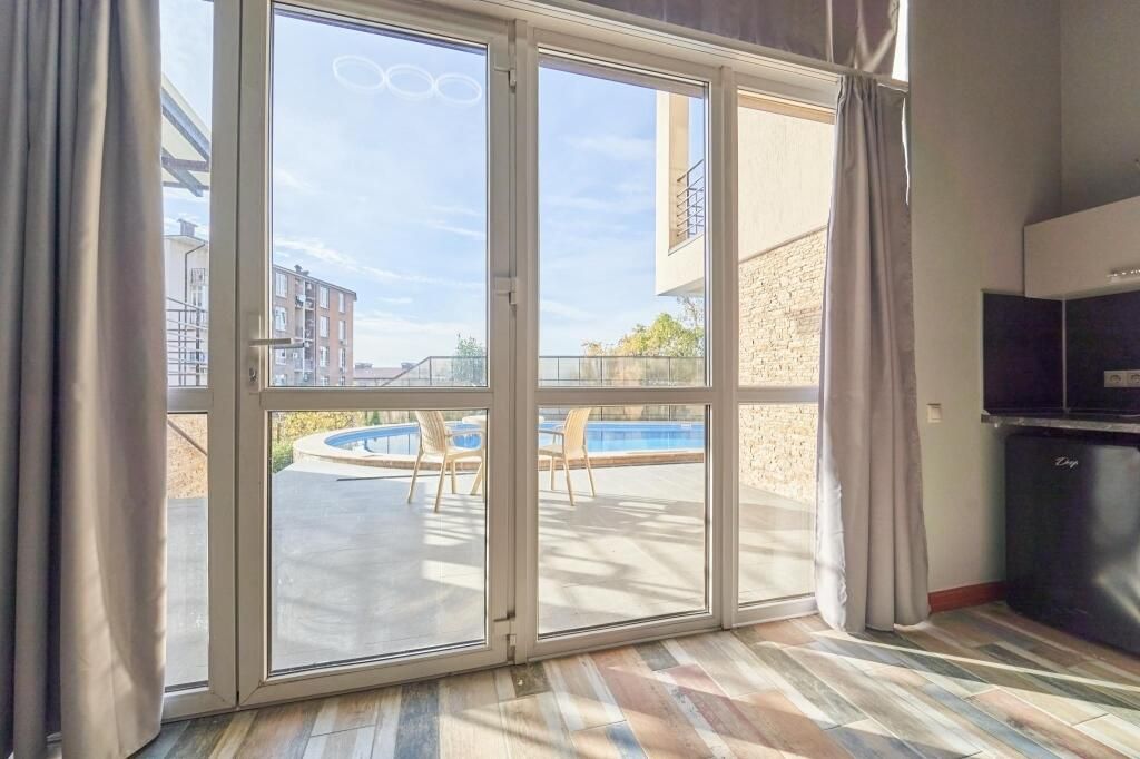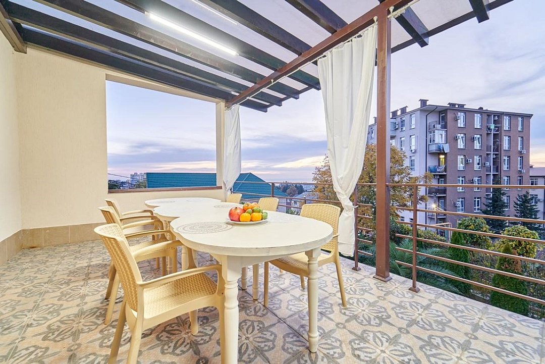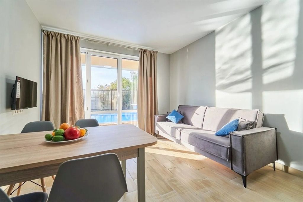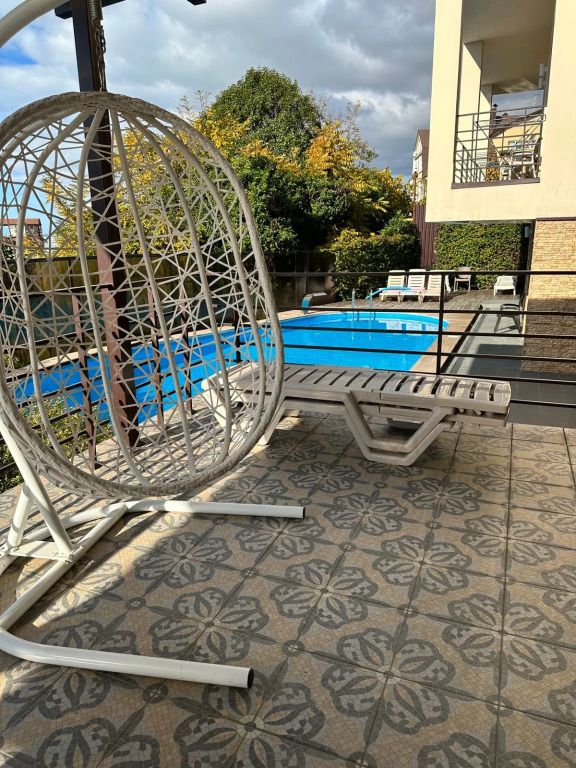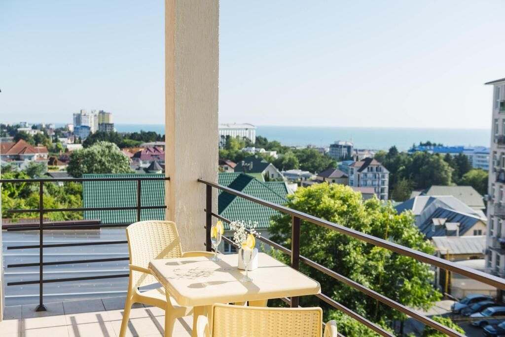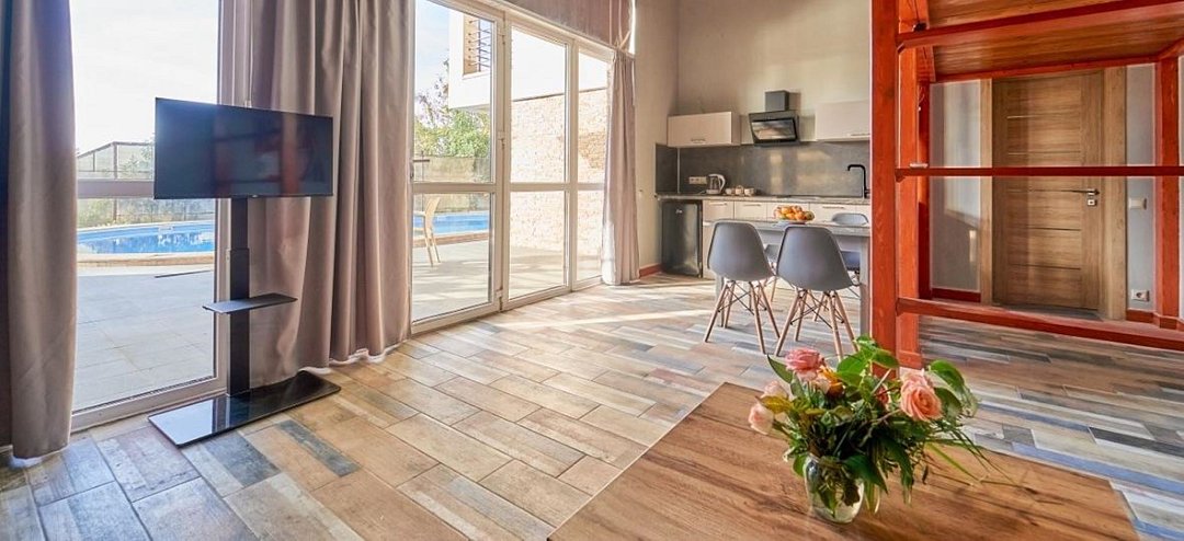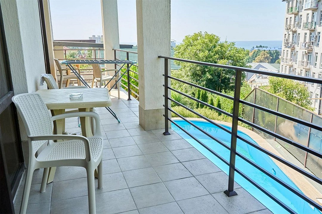 Двухкомнатный номер "Люкс" с выходом на бассейн или без, с большим балконом и видом на море балконом. Категория номера, двухкомнатный люкс закреплена за четырьмя номера на разных этажах , два из них на первом этаже с выходом на бассейн, два из них на втором этаже с верандой и видом на море. Распределение номеров, в день заезда по факту свободных номеров.Услуги и удобства