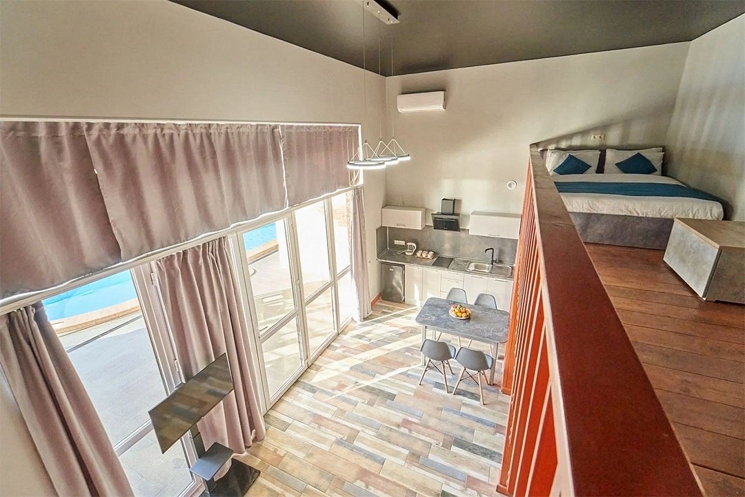 Двухуровневый номер с кухней и видом на бассейн.