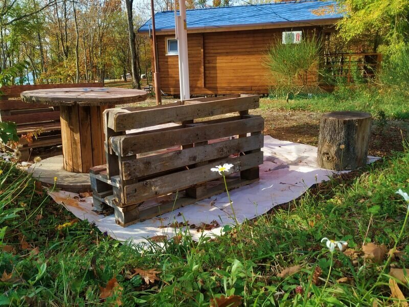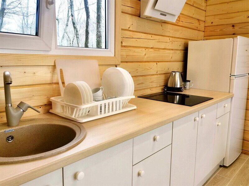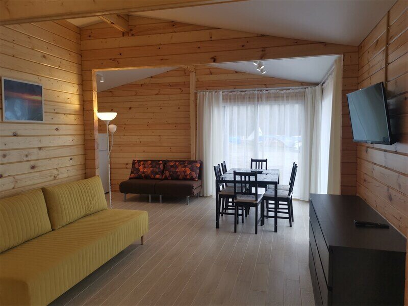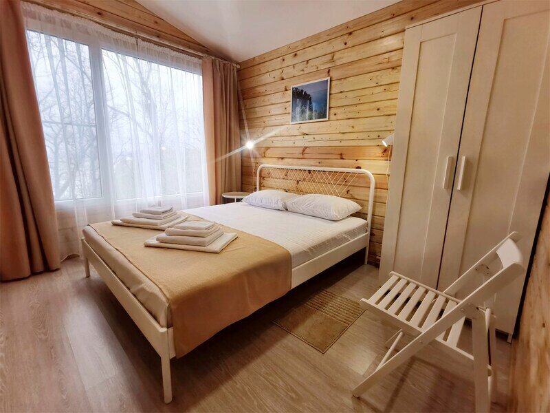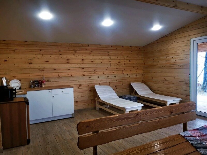 Также на территории базы отдыха есть просторные и уютные деревянные дома, которые оснащены всем необходимым для комфортного проживания. В домах есть кухня с посудой, гостиная зона с телевизором и спальные комнаты с удобными кроватями.