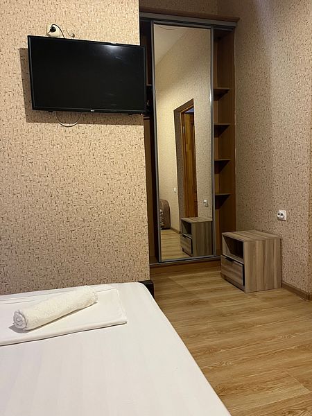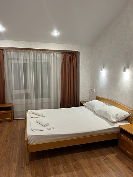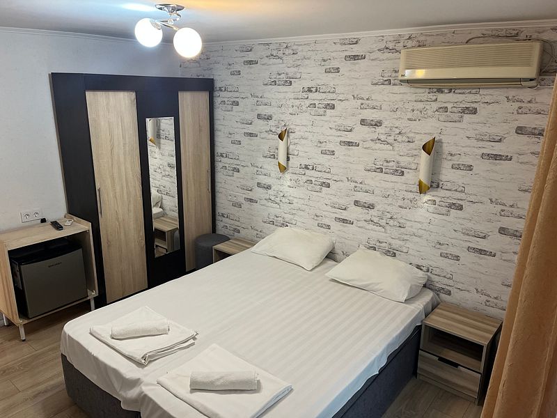 Имеет спальню с приятным интерьером. В номере: 1 двуспальная кровать, 1 диван односпальный. Имеется телевизор, кондиционер, шкаф, холодильник, стулья. Индивидуальная ванная комната: душ, раковина, туалет. В стоимость входит: Постельное бельё, полотенца, мыло. WI-Fi бесплатно на всей территории. Бесплатная общественная парковка за территорией.
