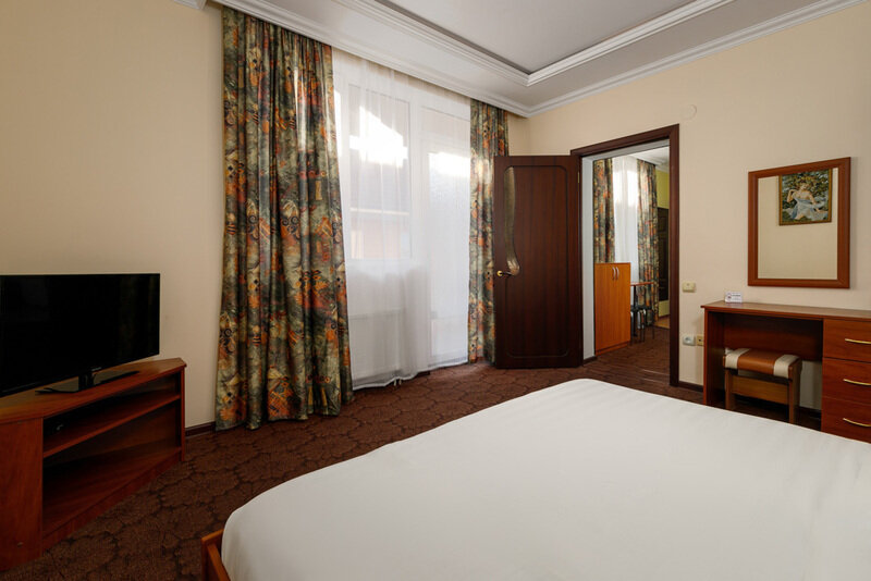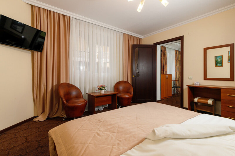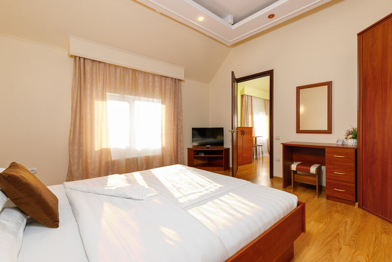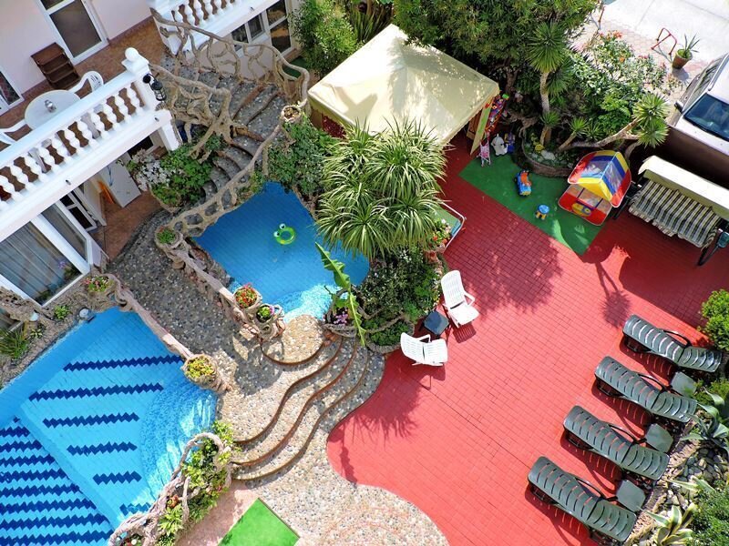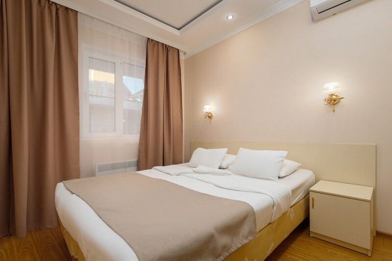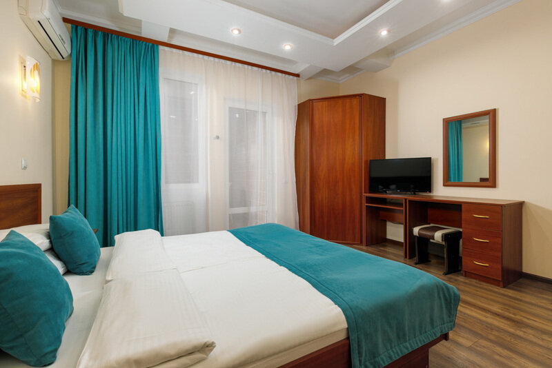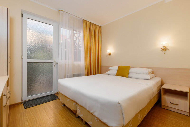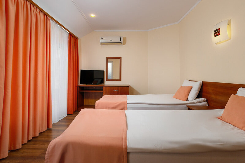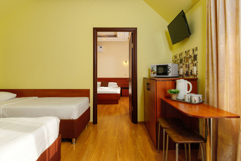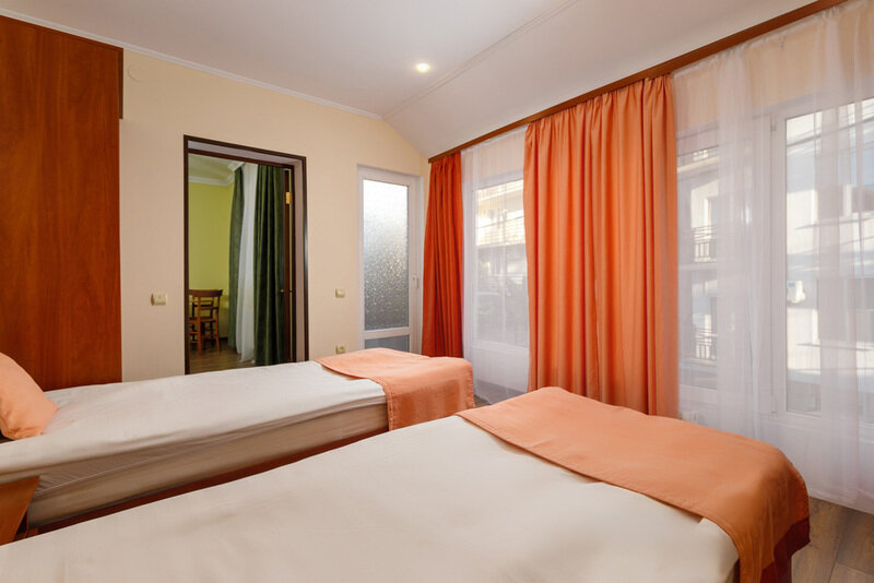 Гости могут выбрать уютные апартаменты с двумя изолированными спальнями и кухней, а также двухкомнатные или двух-трехместные номера. В каждом номере есть телевизор, холодильник, сплит-система и сейф. На территории отеля имеется подогреваемый бассейн.