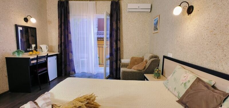 Двуспальная кровать, прикроватная тумбочка, туалетный столик, шкаф, ТВ, кондиционер, мини-холодильник, чайник, сушка, ванная комната с душевой кабинкой, индивидуальный внутренний дворик с мебелью.