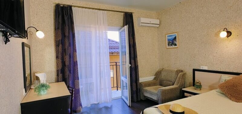 Самолетом до аэропорта г. Анапа, далее на маршрутном такси №113 до остановки «Аквапарк», далее на маршрутном такси №114 до остановки «Аквамарин», далее пройти пешком 261 м до отеля.
