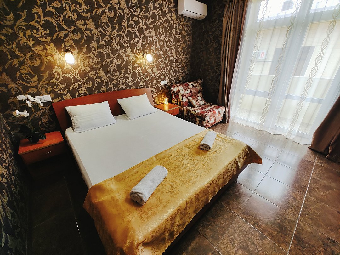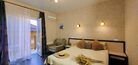Двуспальная кровать, кресло-кровать, прикроватная тумбочка, туалетный столик, вешалка, шкаф, кондиционер, мини-холодильнк, телевизор, ванная комната с душевой кабинкой, балкон.