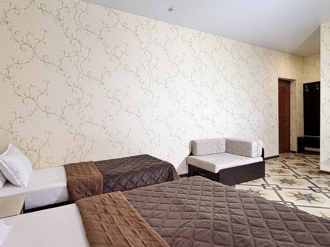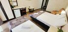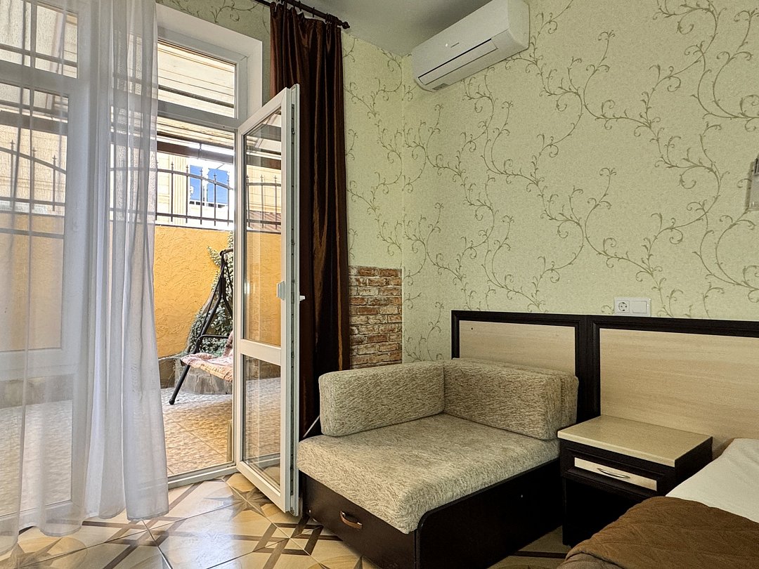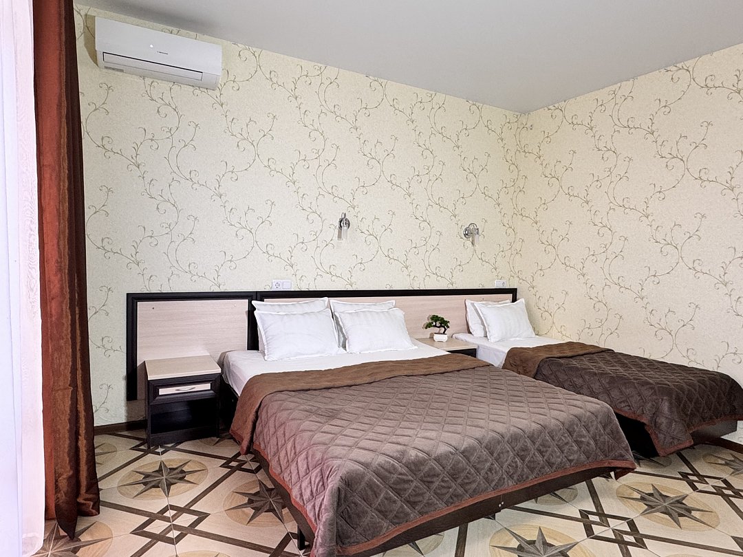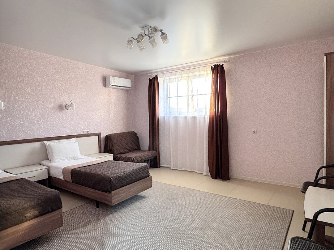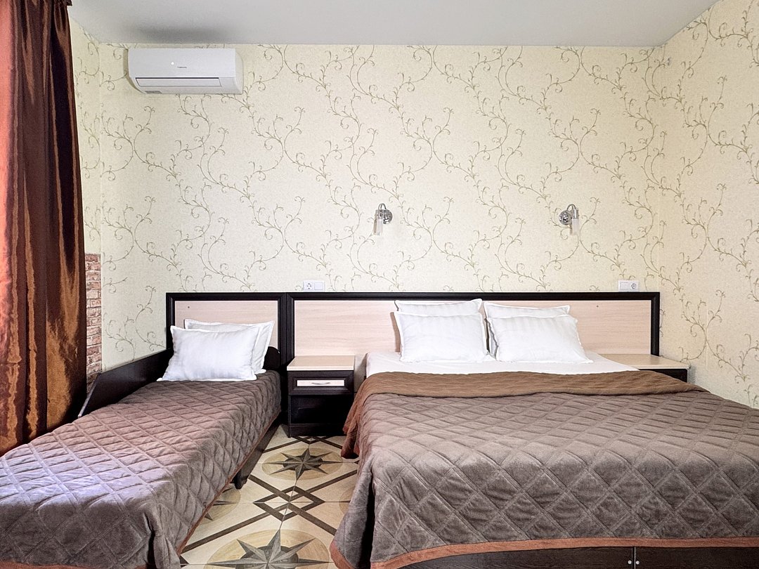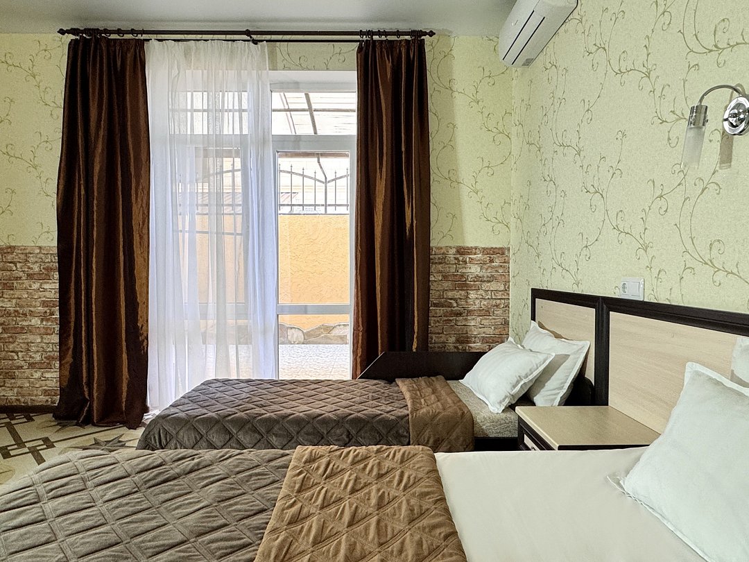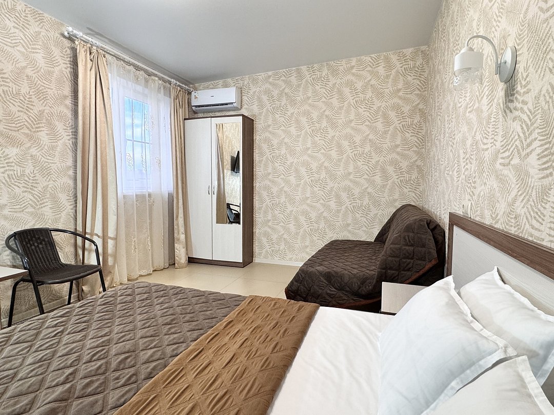 Двуспальная кровать, 2 односпальные кровати, прикроватная тумбочка, туалетный столик, шкаф, ТВ, кондиционер, мини-холодильник, чайник, сушка, ванная комната с душевой кабинкой, индивидуальный внутренний дворик с мебелью.