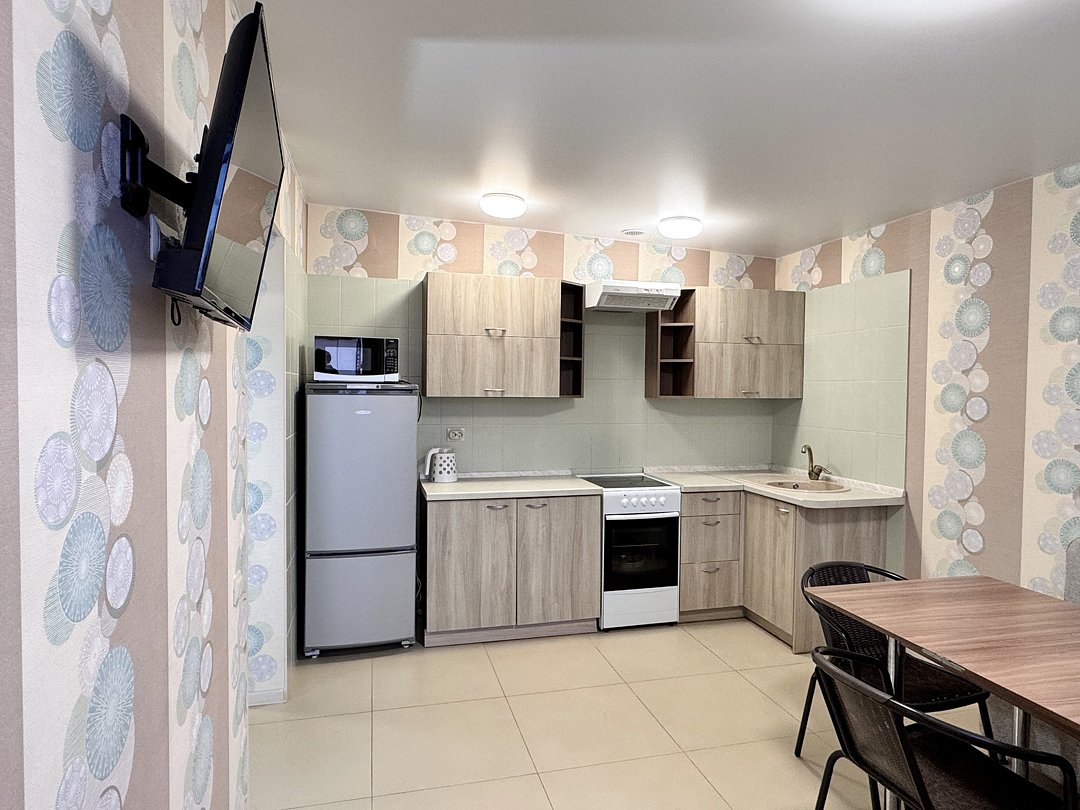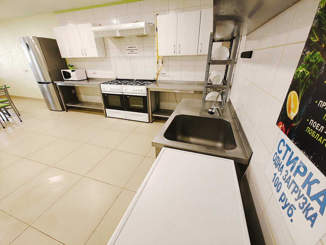 Кухня-гостиная: кухня, холодильник, плита, СВЧ печь, диван-кровать, чайник, посуда, обеденная зона, ТВ- триколор.