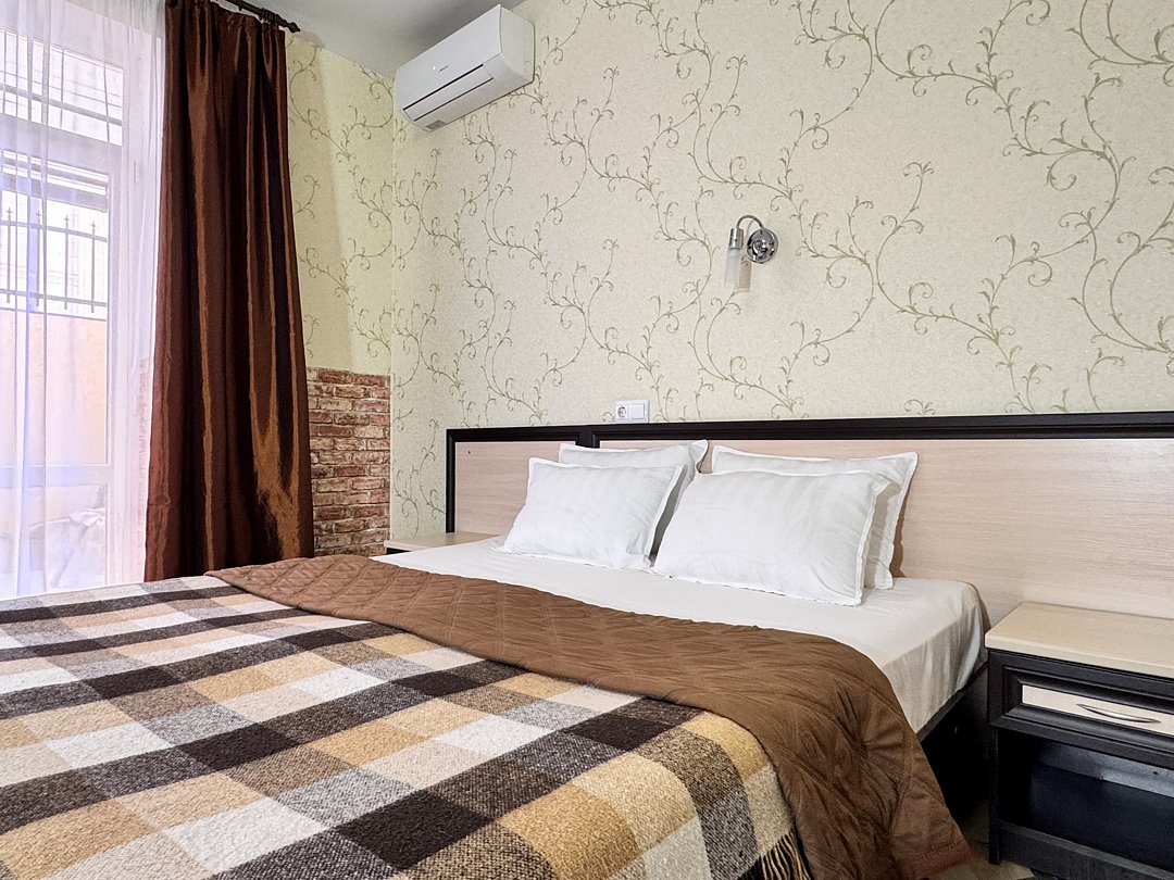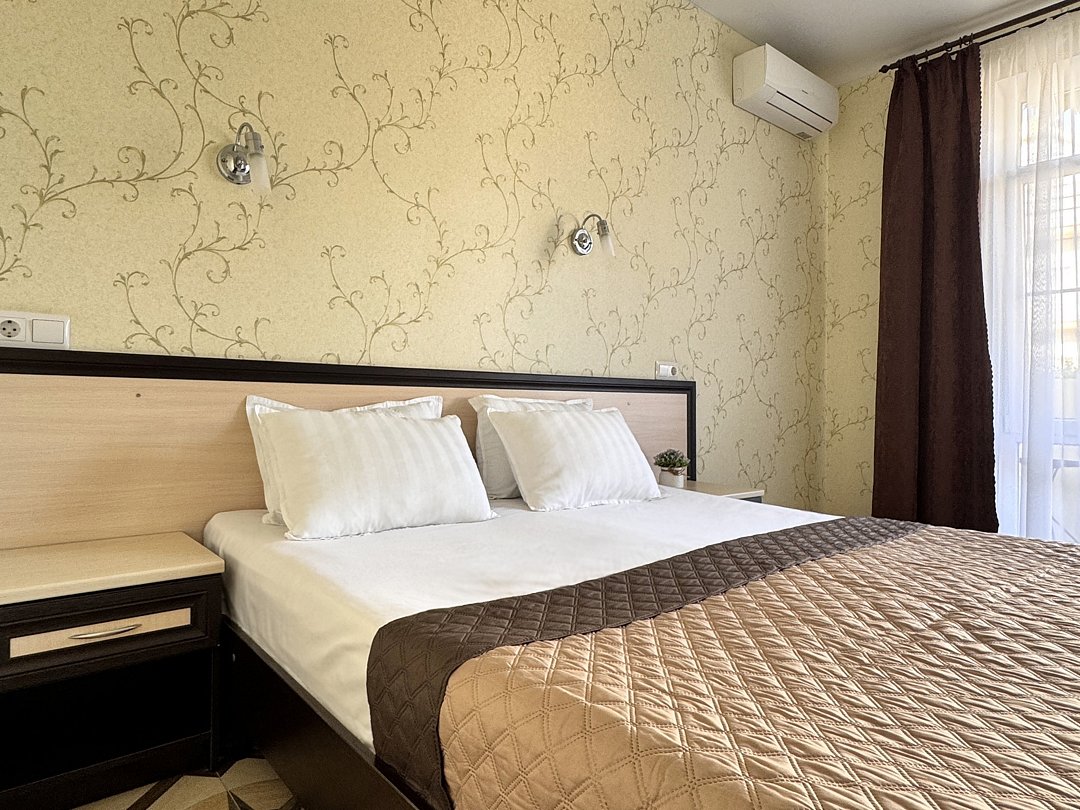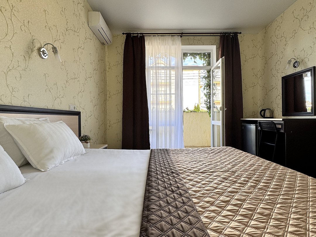 Двуспальная кровать, прикроватная тумбочка, туалетный столик, зеркало, вешалка, шкаф, кондиционер, мини-холодильник, телевизор, чайник, ванная комната с душевой кабинкой, балкон.