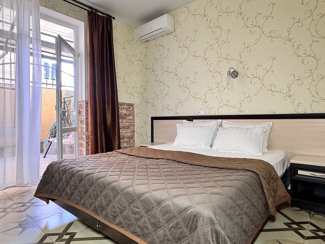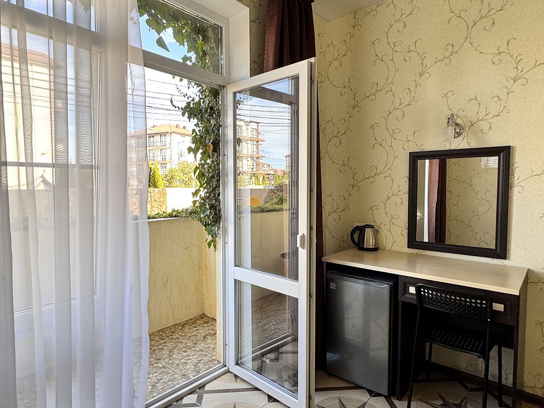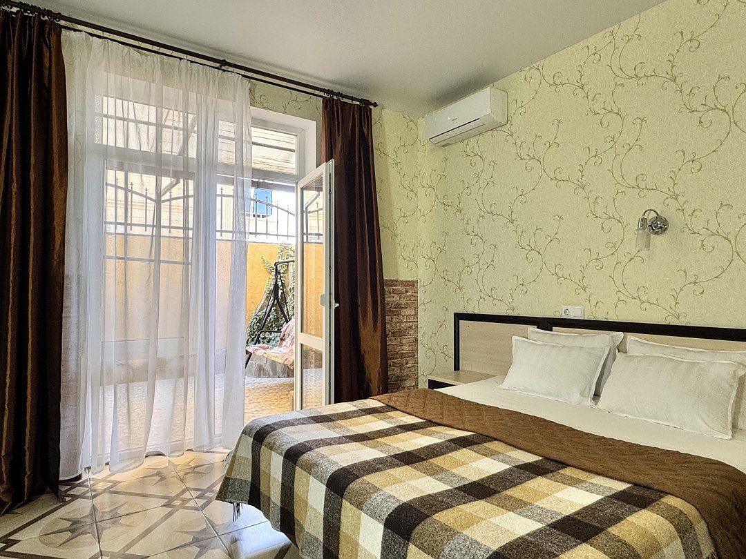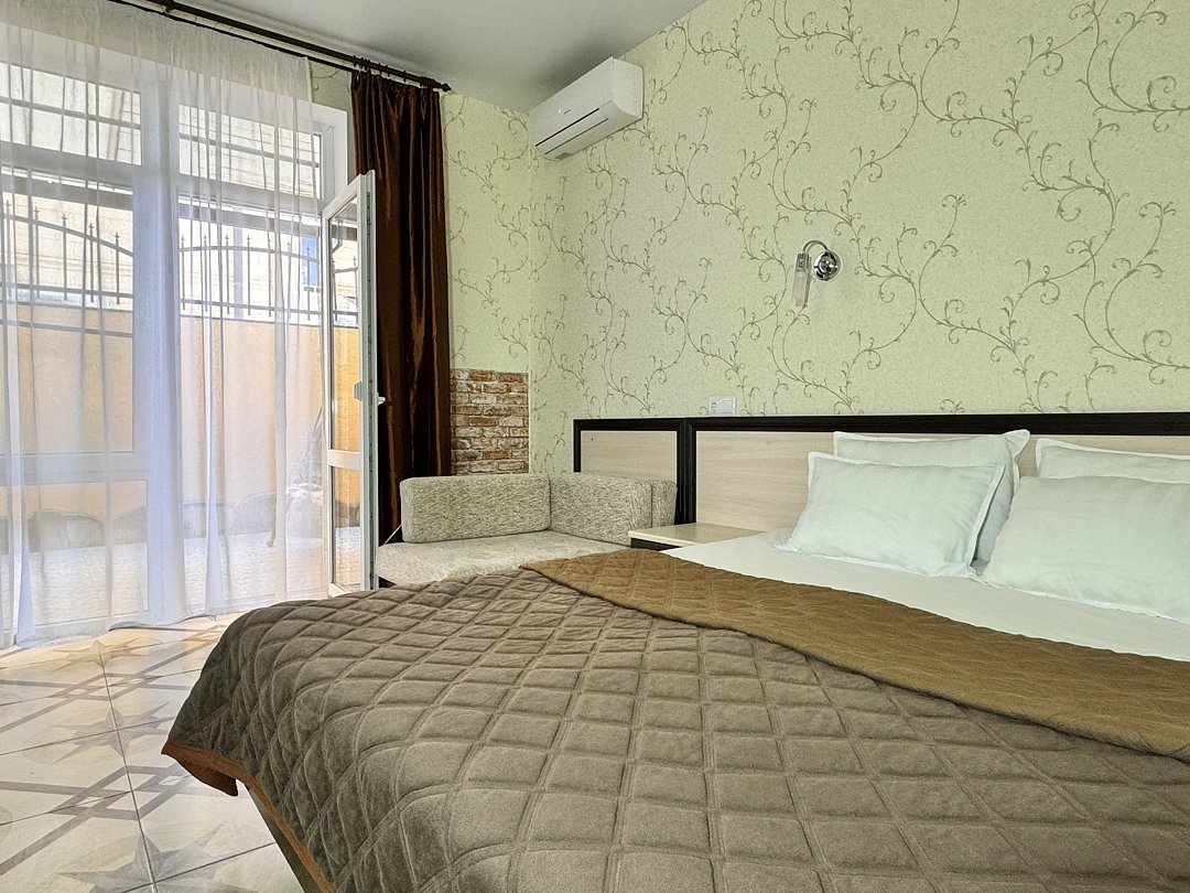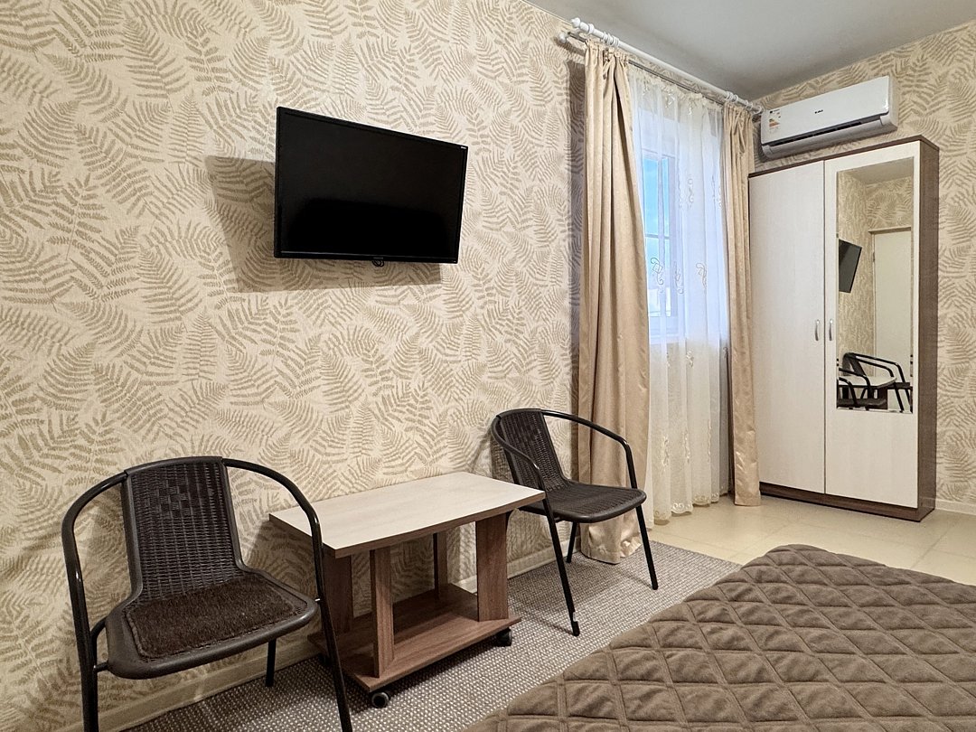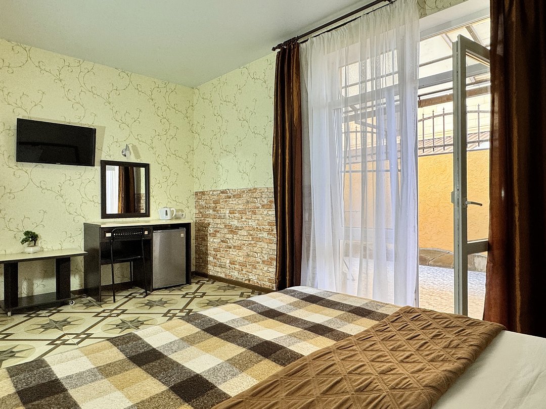 Двуспальная кровать, прикроватная тумбочка, туалетный столик, зеркало, шкаф, ТВ, кондиционер, мини-холодильник, чайник, сушка, ванная комната с душевой кабинкой, индивидуальный внутренний дворик с мебелью.