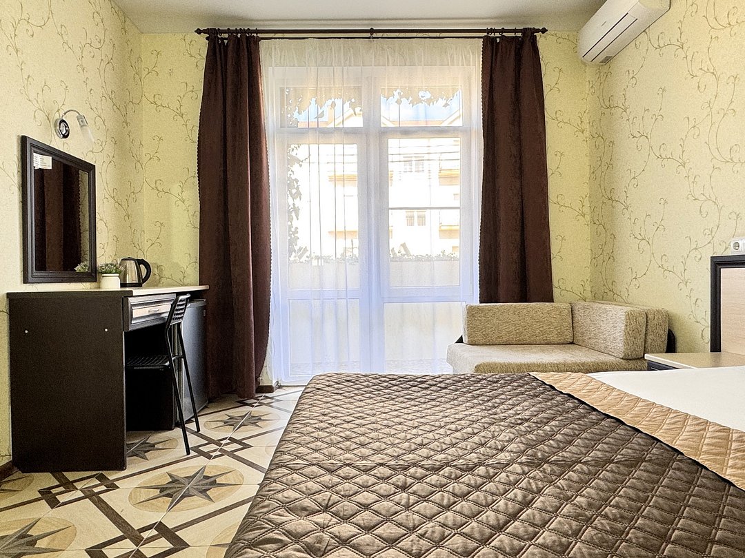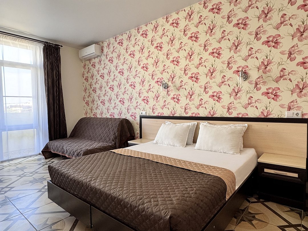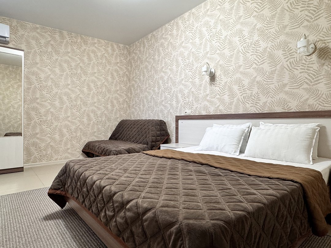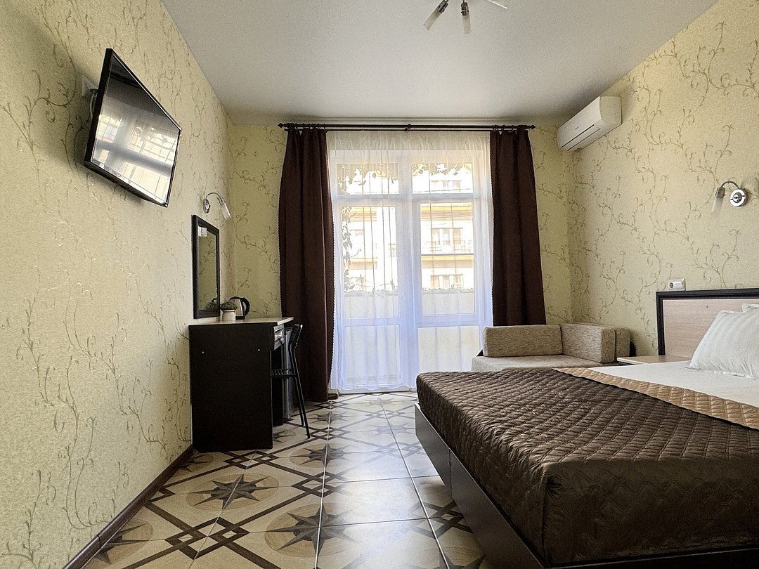 Двуспальная кровать, односпальная кровать, кресло-кровать, прикроватная тумбочка, туалетный столик, зеркало, вешалка, шкаф, кондиционер, мини-холодильник, телевизор, ванная комната с душевой кабинкой, балкон.