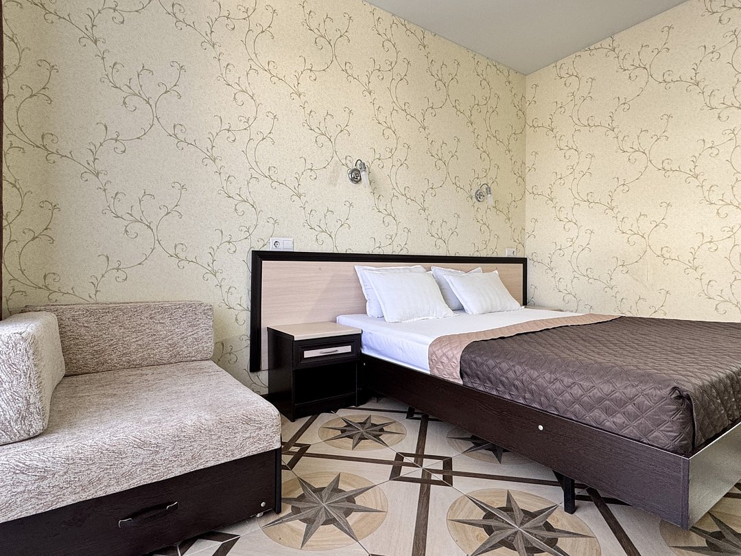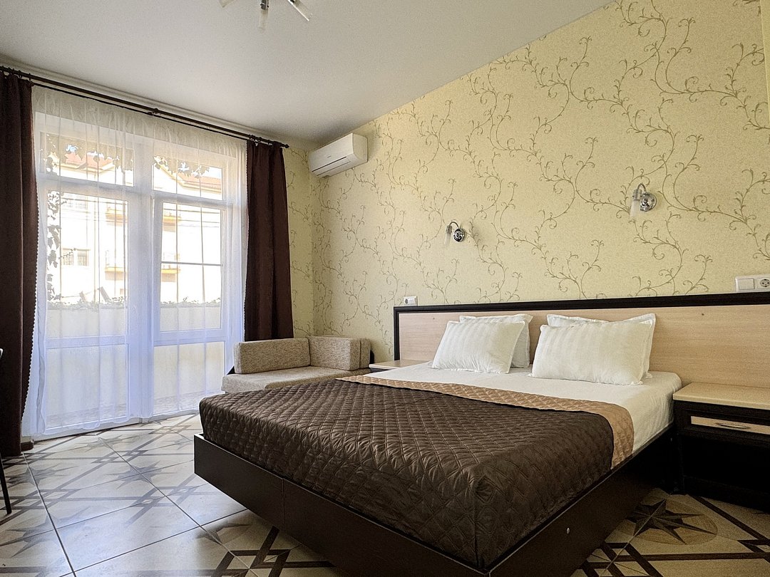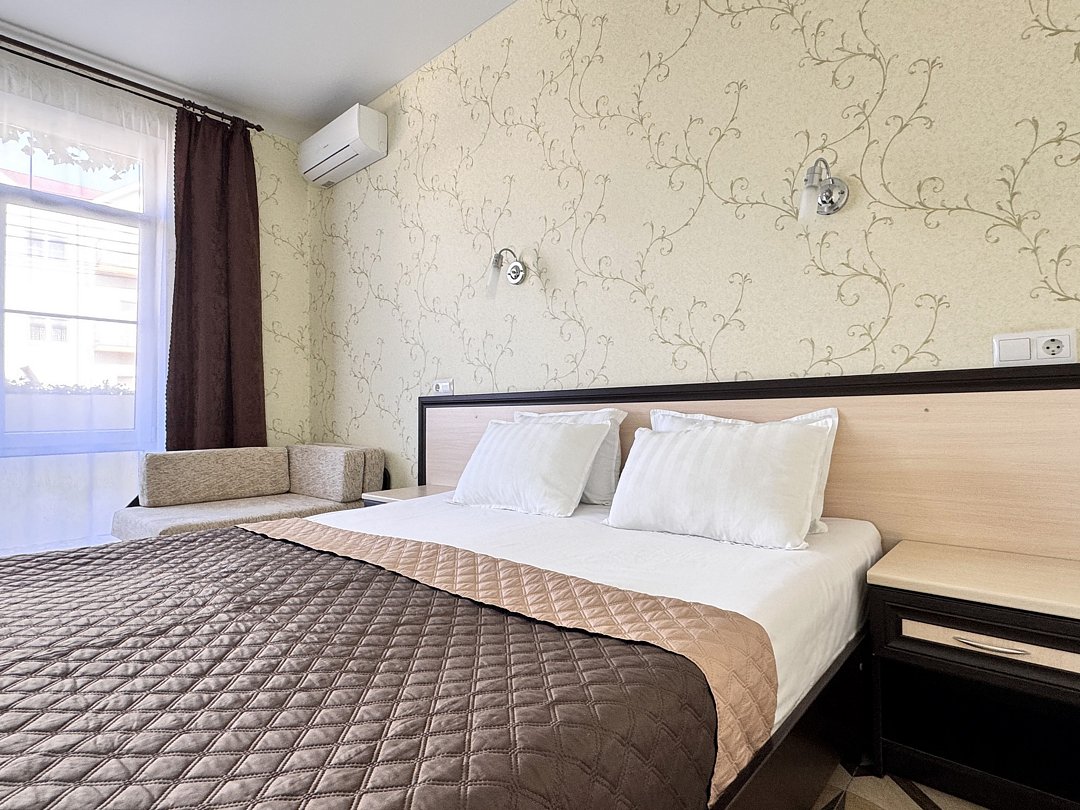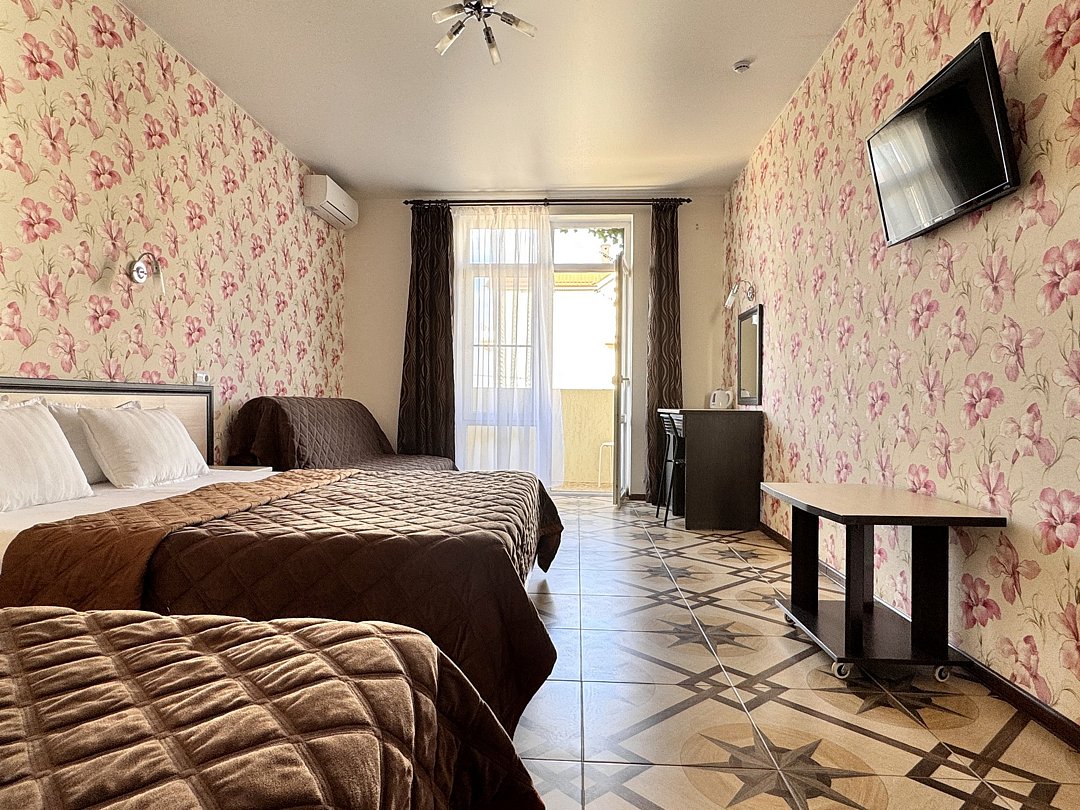 Двуспальная кровать, односпальная кровать, кресло-кровать, прикроватная тумбочка, туалетный столик, зеркало, вешалка, шкаф, кондиционер, мини-холодильник, телевизор, ванная комната с душевой кабинкой, балкон.