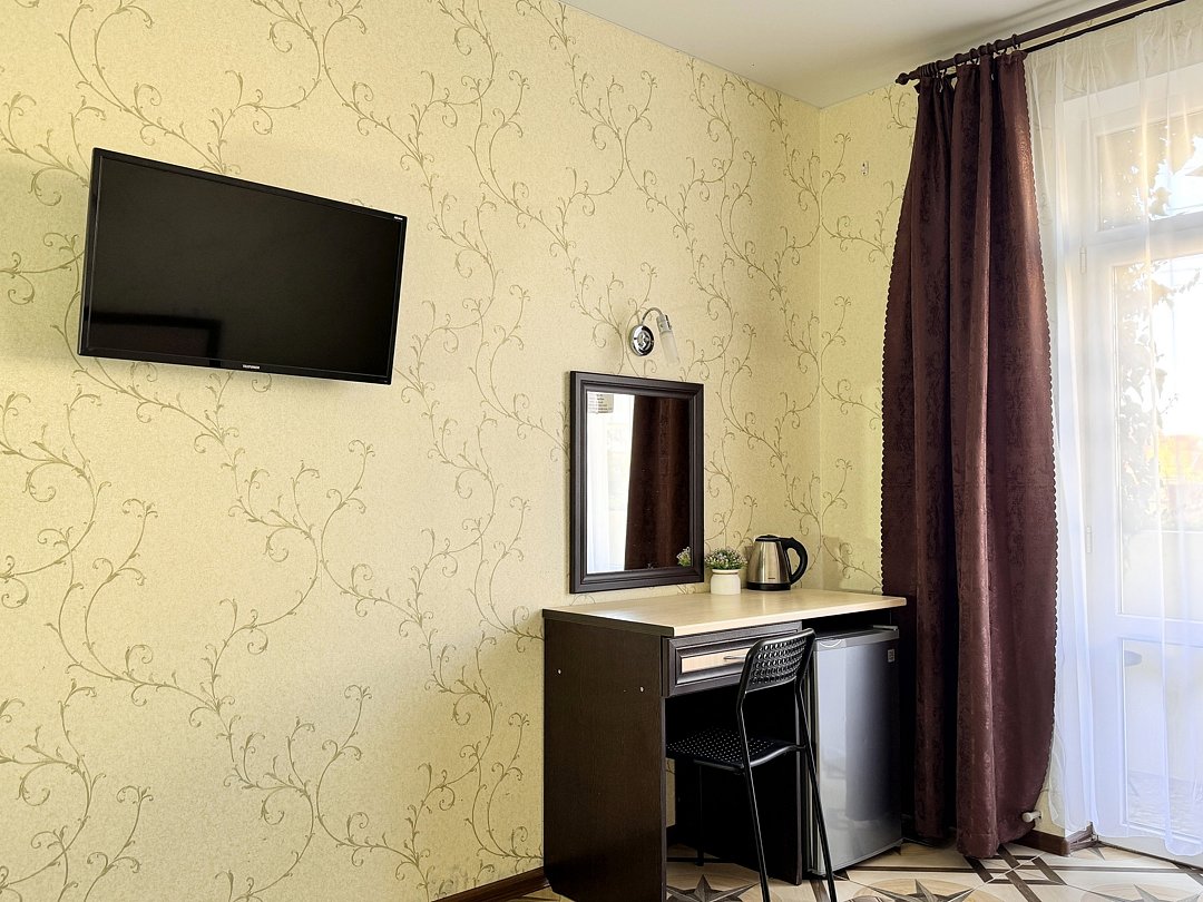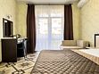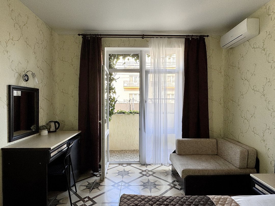 Двуспальная кровать, кресло-кровать, прикроватная тумбочка, туалетный столик, зеркало, вешалка, шкаф, кондиционер, мини-холодильник, чайник, телевизор, ванная комната с душевой кабинкой, балкон.