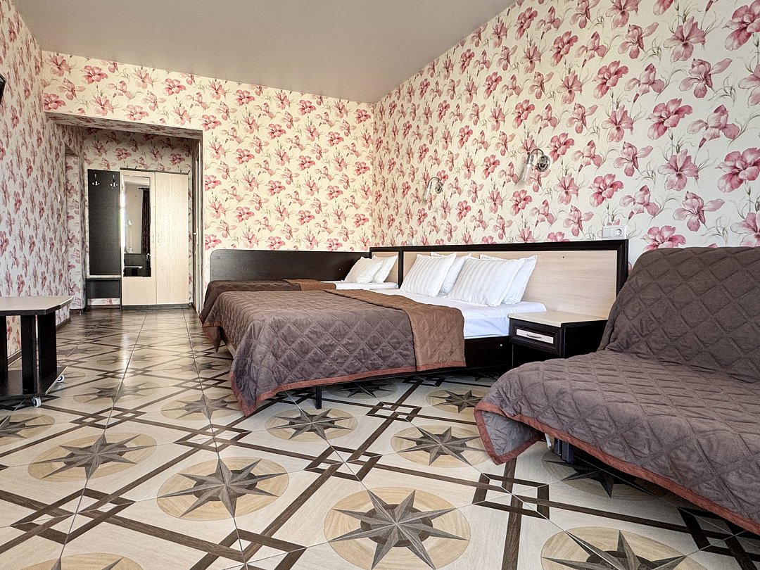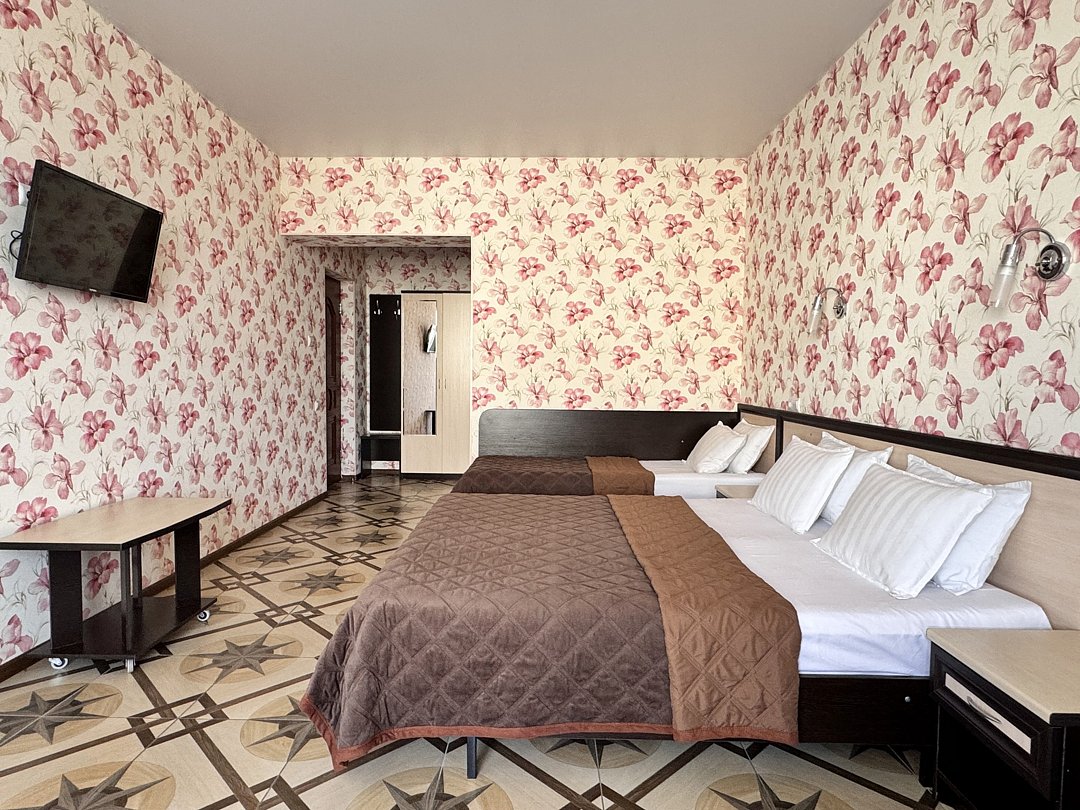 Двуспальная кровать, односпальная кровать, двуспальный раскладной диван, прикроватная тумбочка, туалетный столик, зеркало, чайник, вешалка, шкаф, кондиционер, мини-холодильник, телевизор, ванная комната с душевой кабинкой, балкон.