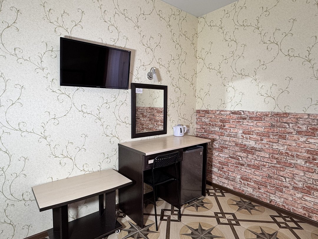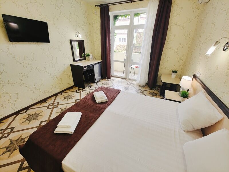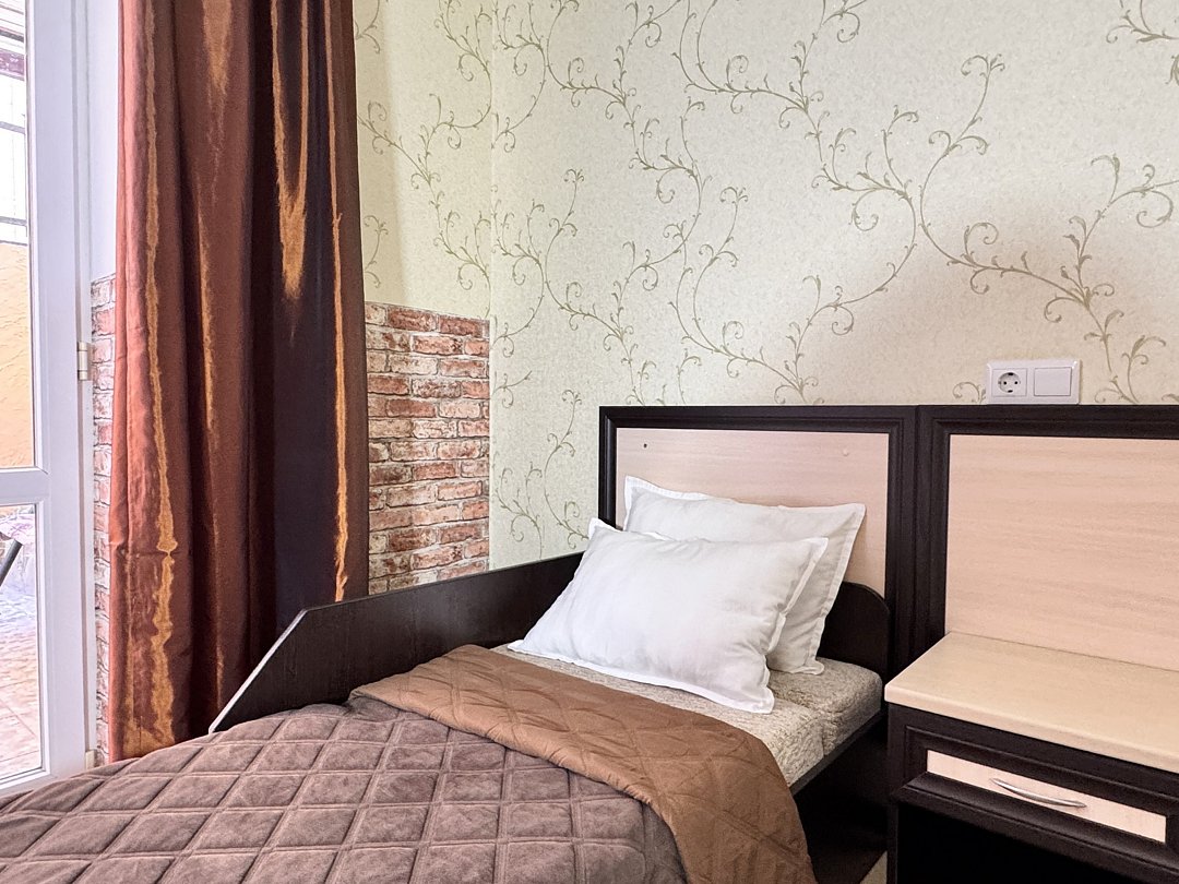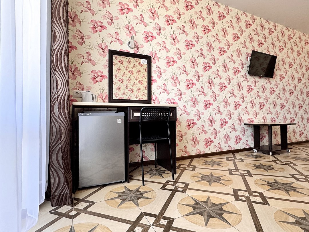 Двуспальная кровать, односпальная кровать, прикроватная тумбочка, туалетный столик, шкаф, ТВ, кондиционер, мини-холодильник, чайник, сушка, ванная комната с душевой кабинкой, индивидуальный внутренний дворик с мебелью.