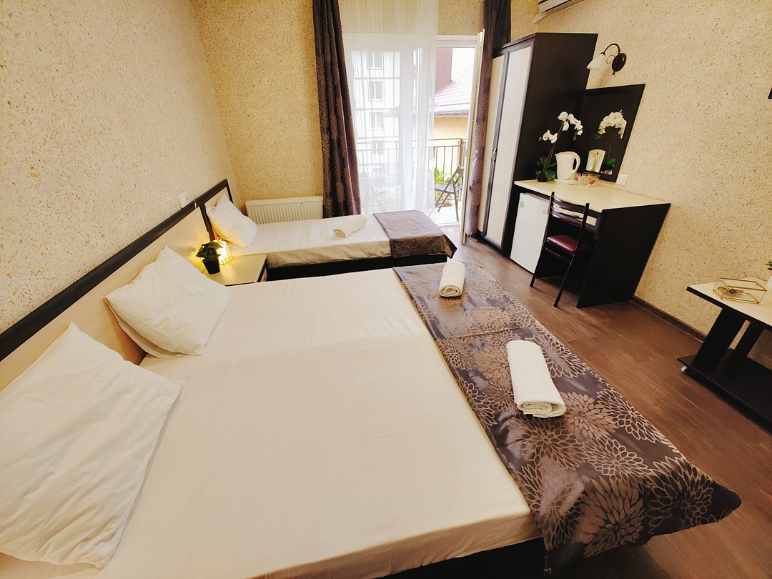 Двуспальная кровать, односпальная кровать, двуспальный раскладной диван, прикроватная тумбочка, туалетный столик, вешалка, шкаф, кондиционер, мини-холодильнк, телевизор, ванная комната с душевой кабинкой, балкон.