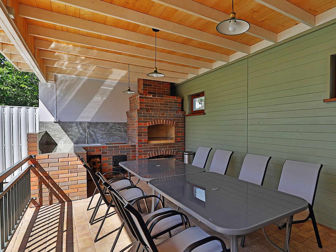 Вторая зона находится под навесом перед бассейном и оснащена металлическим мангалом и раковиной, что позволяет гостям наслаждаться шашлыками в комфортной обстановке.