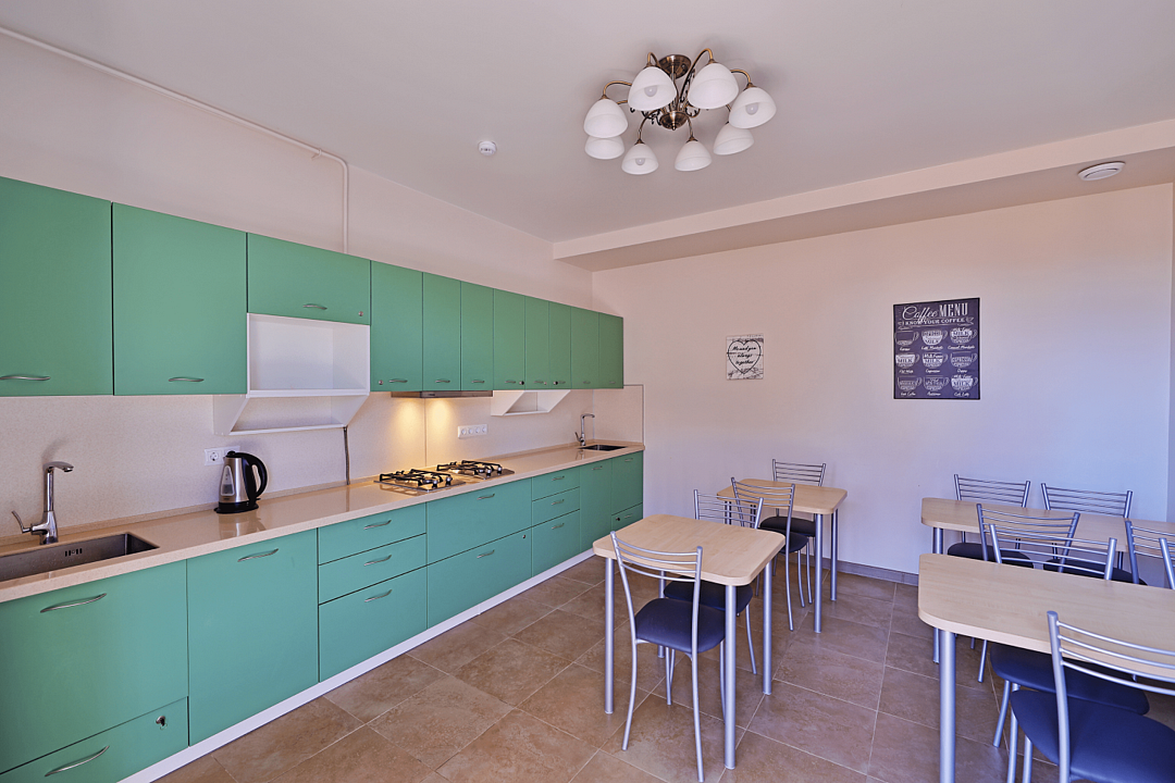 Гостей встречает светлая и просторная общая кухня, где каждый может почувствовать себя как дома. Здесь, среди уютной атмосферы и тщательно подобранной бытовой техники — плиты, микроволновой печи, чайника и холодильника — готовятся домашние блюда.