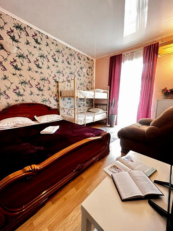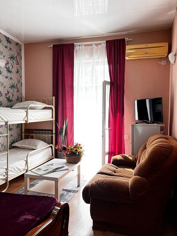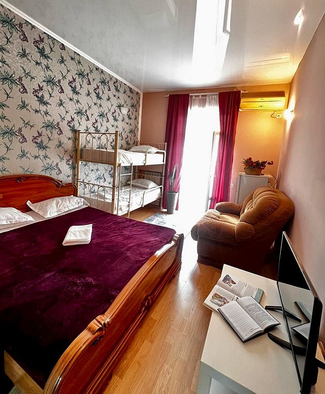 В номере: 1 двуспальная и 1 двухярусная кровати, 1 кресло-кровать.