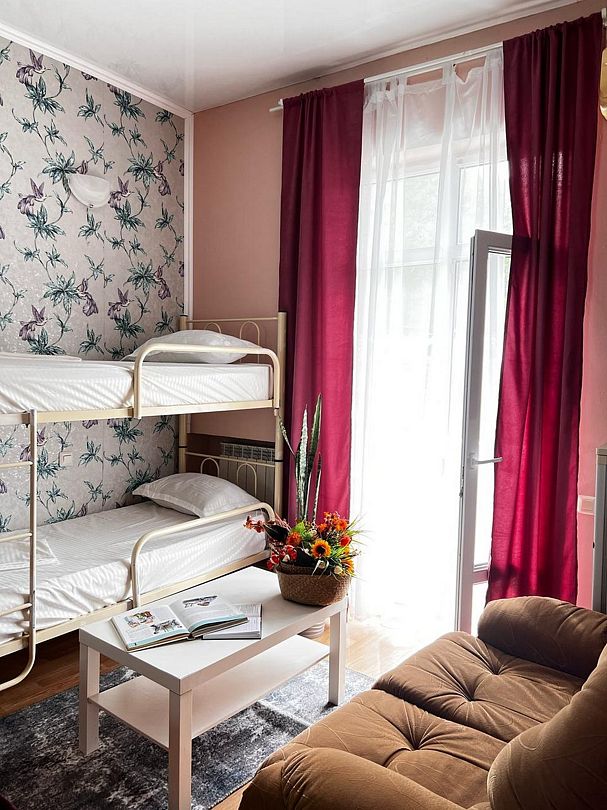 Стандартный семейный четырехместный номер площадью 20 кв. м с видом на горы, город. Подходит для размещения 4 человек.