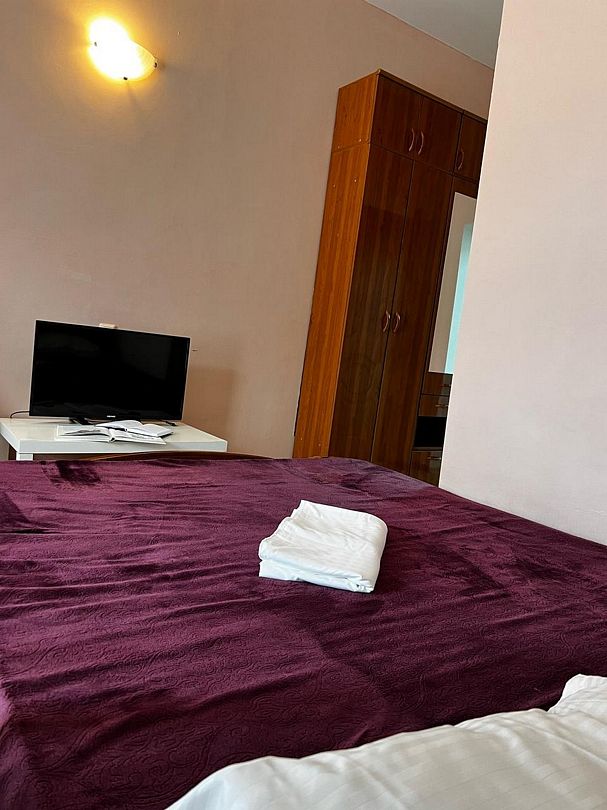 В номере: 1 двуспальная и 2 односпальные кровати. Имеется телевизор, кондиционер, шкаф, вешалка, обеденный стол, холодильник, электрочайник, стулья.