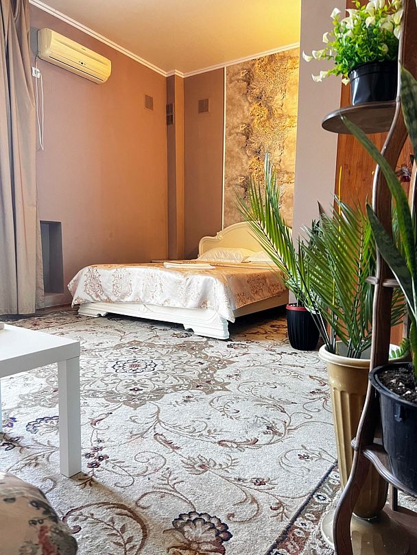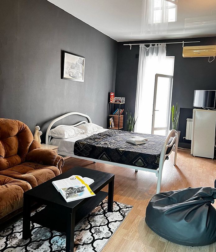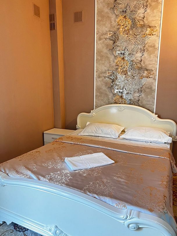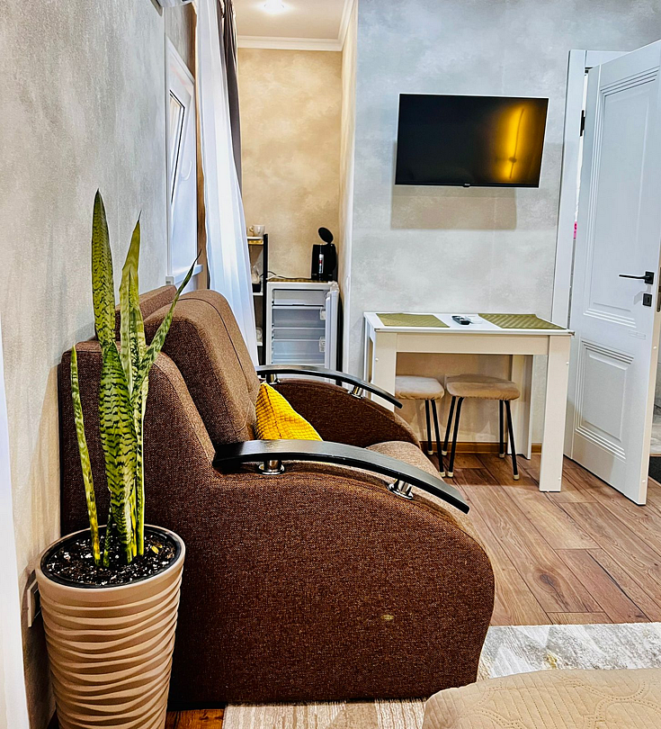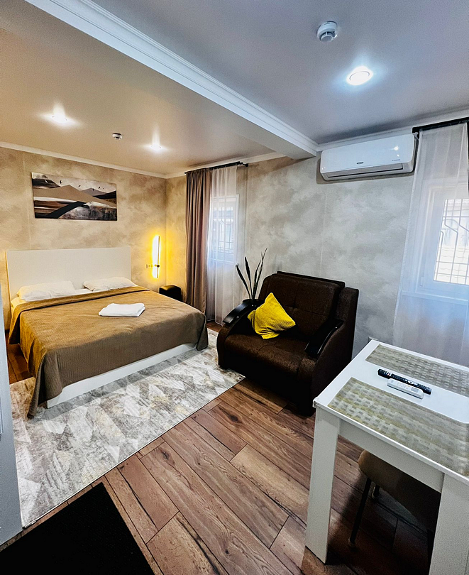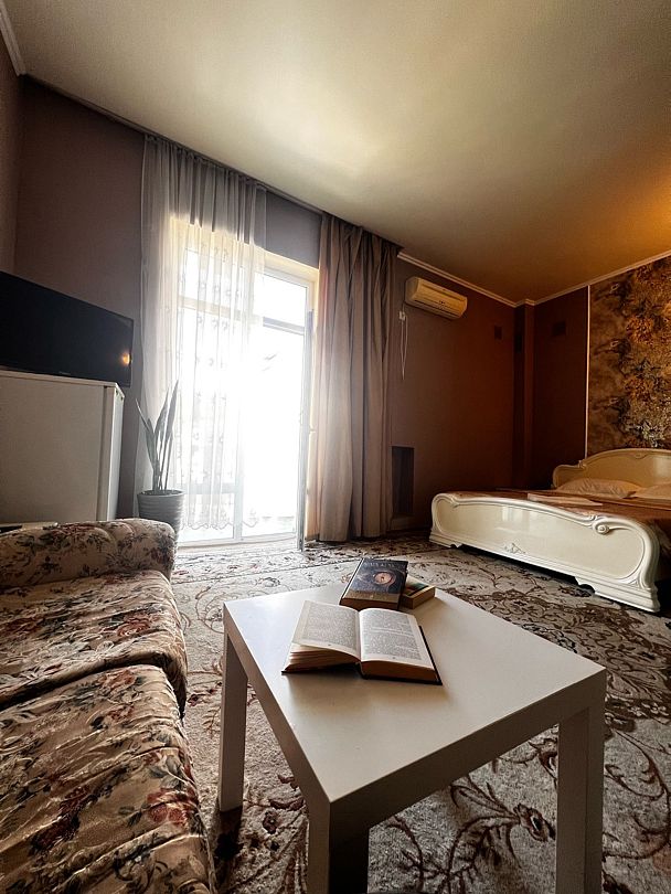 В номере: 1 двуспальная кровать, 1 двуспальный диван. Имеется телевизор, кондиционер, шкаф, вешалка, обеденный стол, холодильник, электрочайник, стулья.