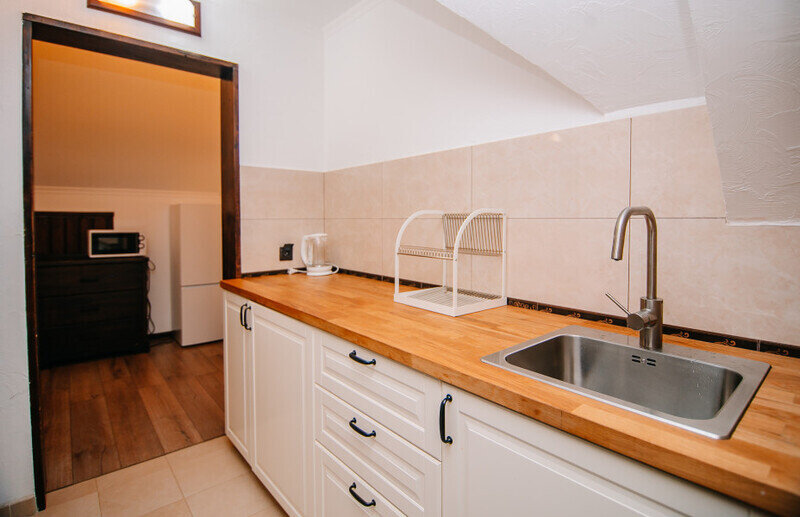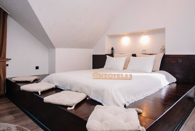 Апартаменты на мансардном этаже. Укомплектованная кухня, обеденная зона, 2 комнаты с кроватями king-size и одна комната с двухъярусной кроватью, 2 балкона с видом на горы, санузел с душем, 3 телевизора, холодильник, стиральная машина