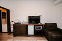 Две раздельные кровати или одна кровать king-size, санузел с душем, балкон с мебелью, телевизор, холодильник, микроволновая печь, чайник, посуда