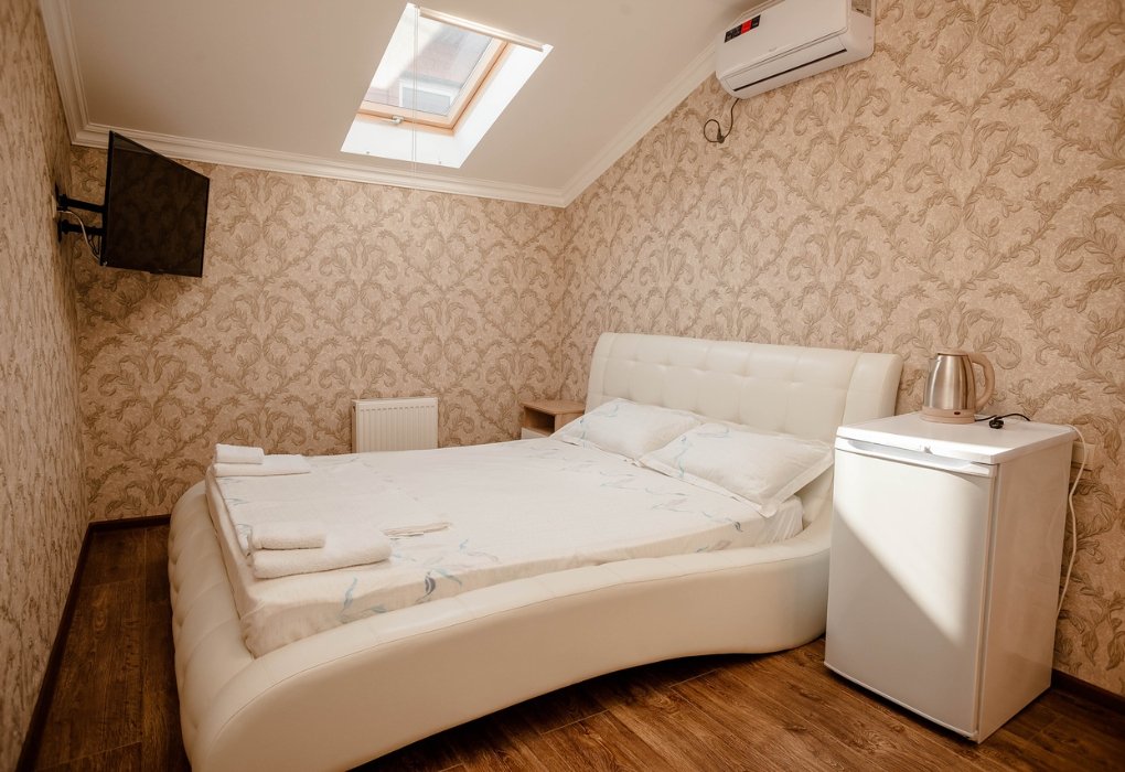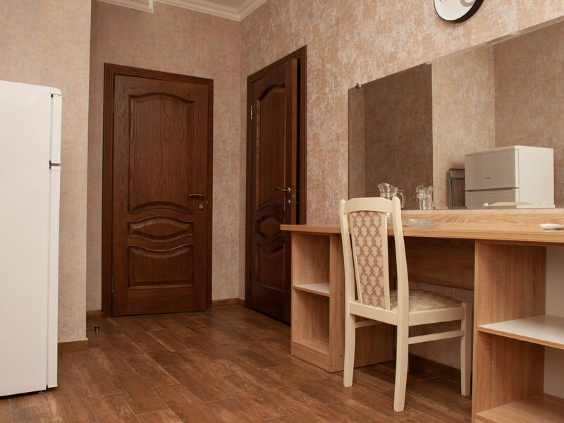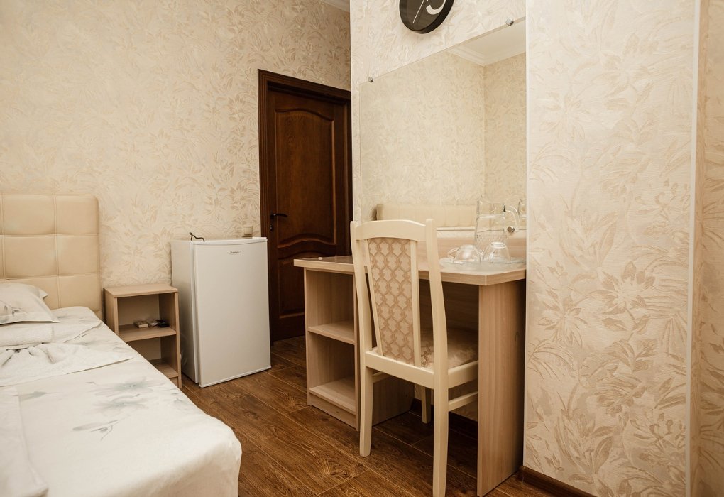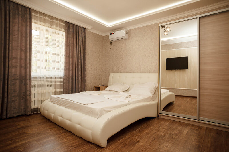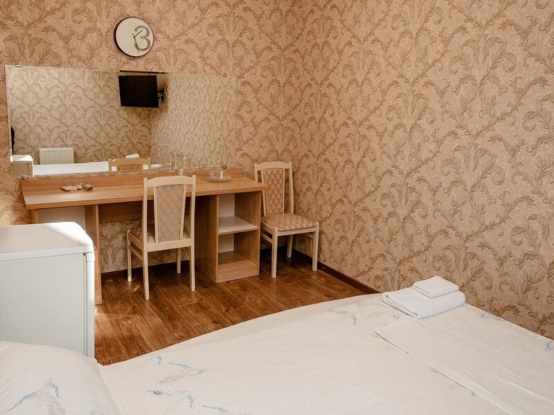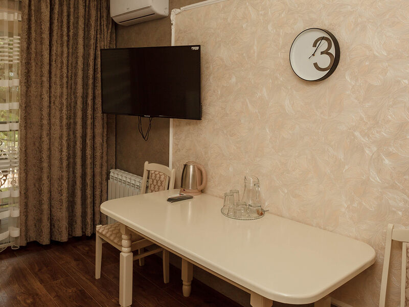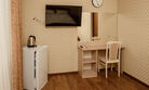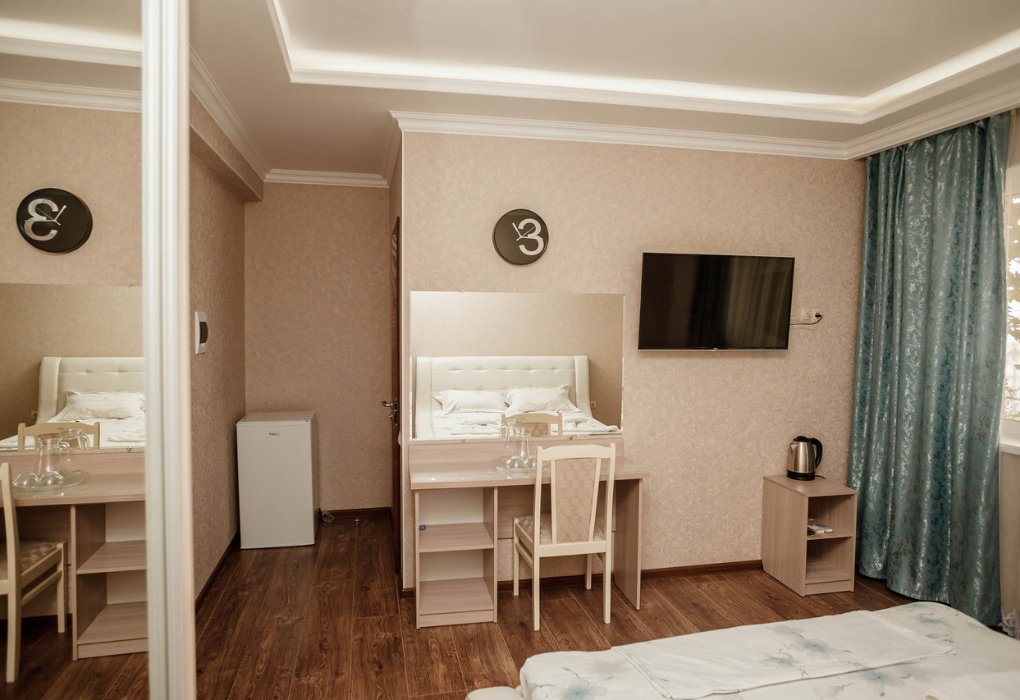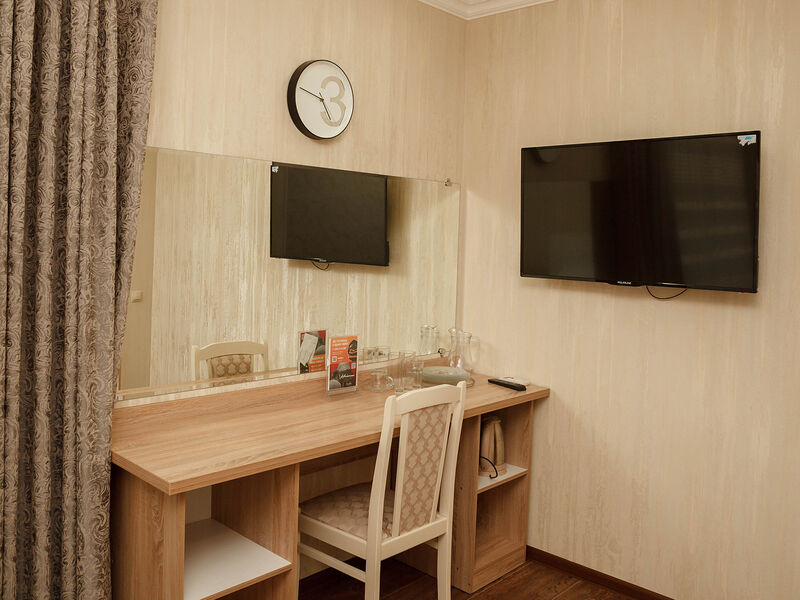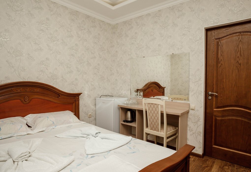 Однокомнатный номер для двоих со всеми необходимыми удобствами. Широкая двуспальная кровать, шкаф с зеркалом в полный рост, стол, стул, кондиционер, плазменный большой телевизор, туалетная комната со своим душем и туалетом. В номере так же есть чайник, холодильник, небольшой набор посуды, фен, сейф. Банные полотенца и косметические средства, ложка для обуви.