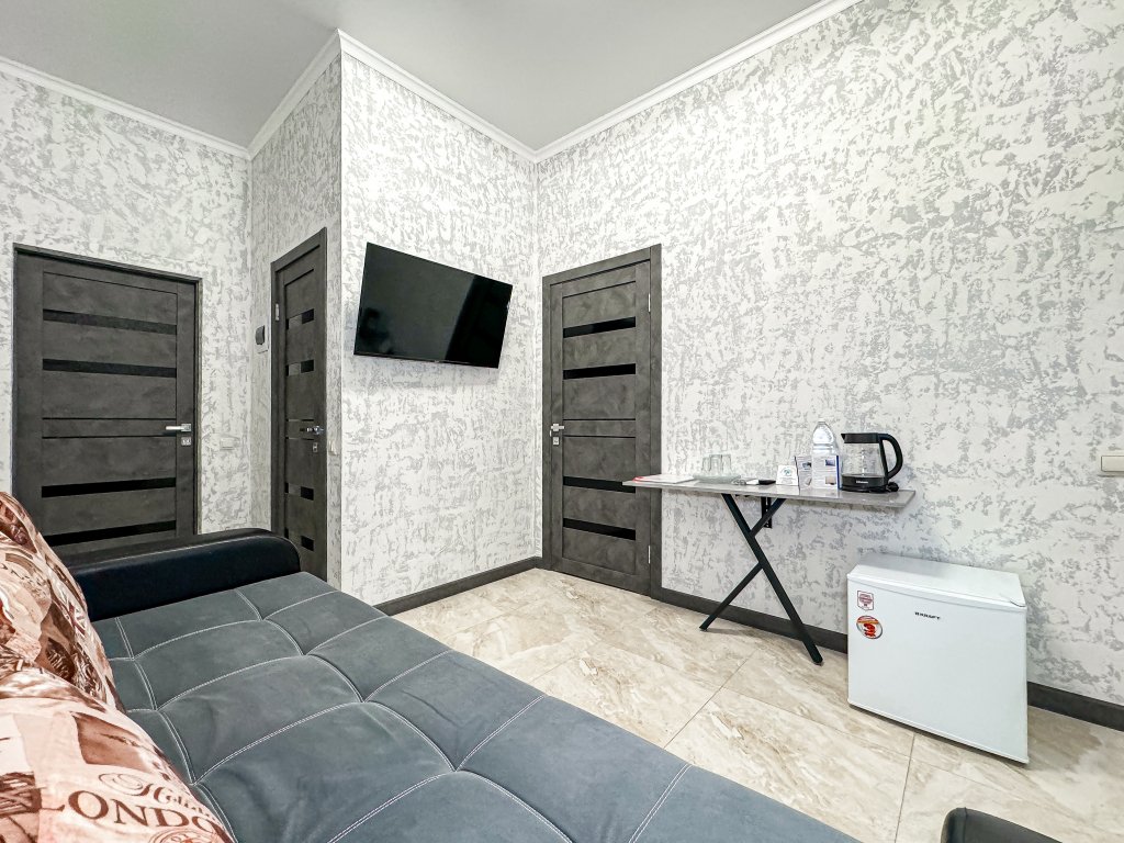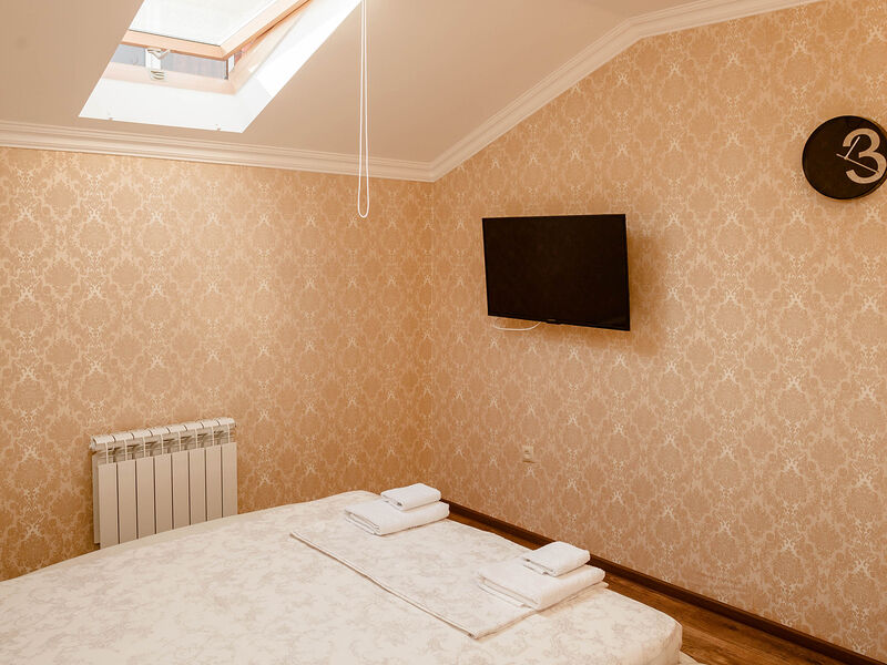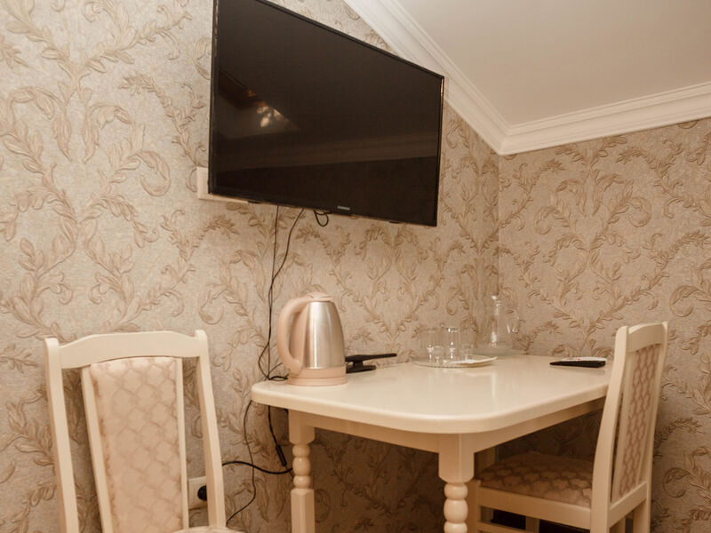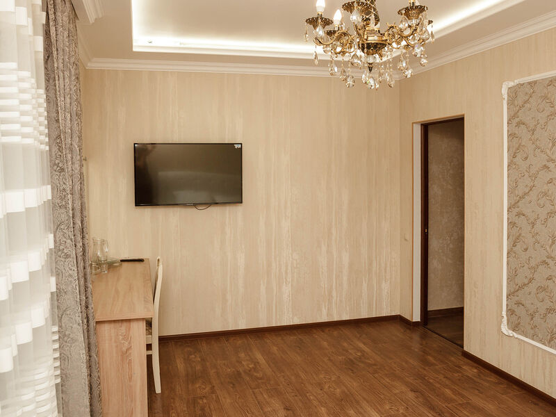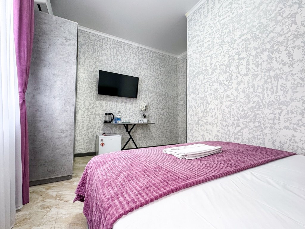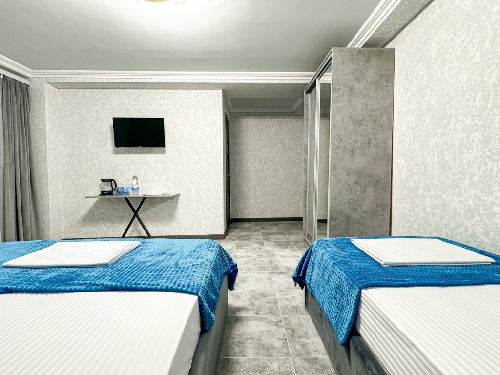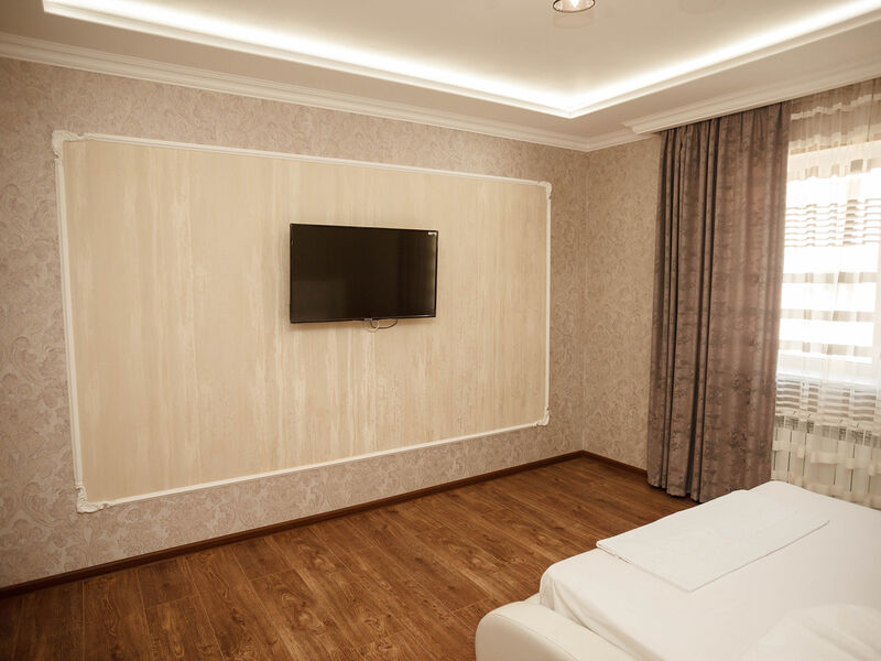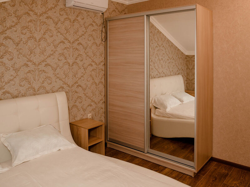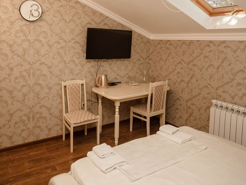 Однокомнатный номер для двоих со всеми необходимыми удобствами. Широкая двуспальная кровать, шкаф с зеркалом в полный рост, стол, стул, кондиционер, плазменный большой телевизор, туалетная комната со своим душем и туалетом. В номере так же есть чайник, холодильник, небольшой набор посуды, фен, сейф. Банные полотенца и косметические средства, ложка для обуви.
