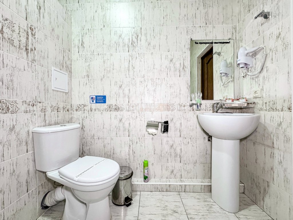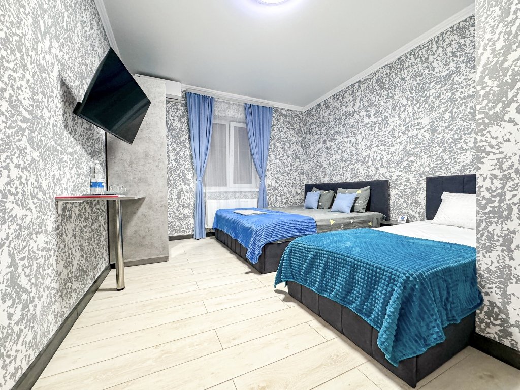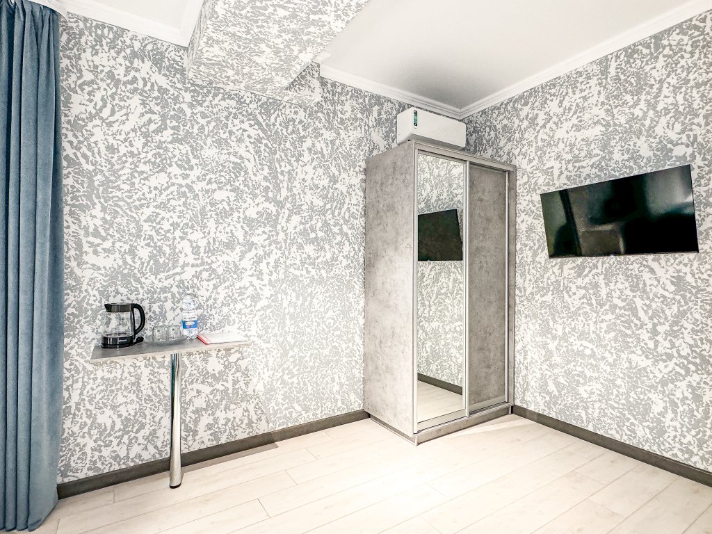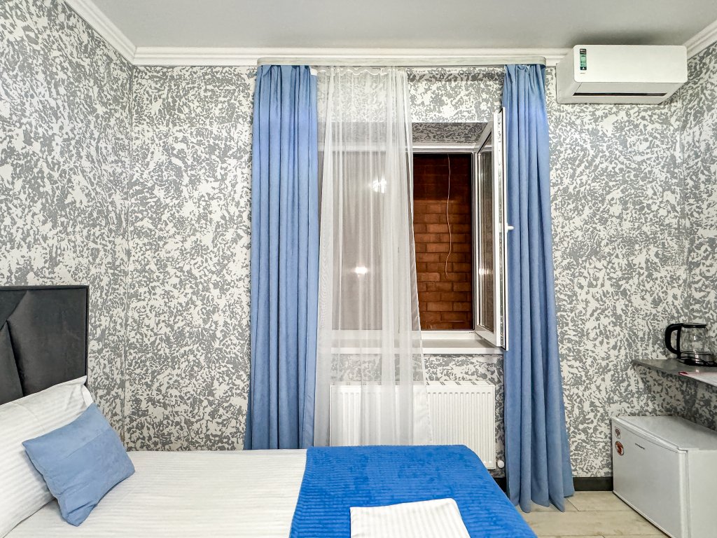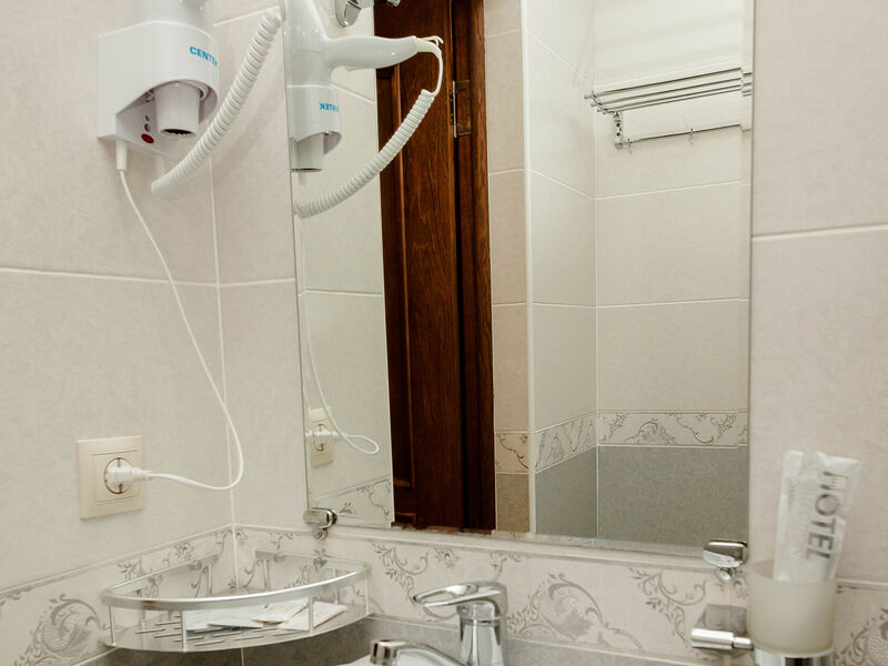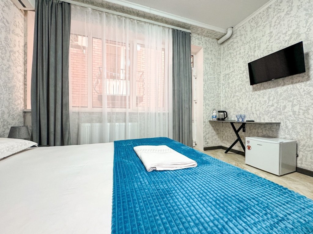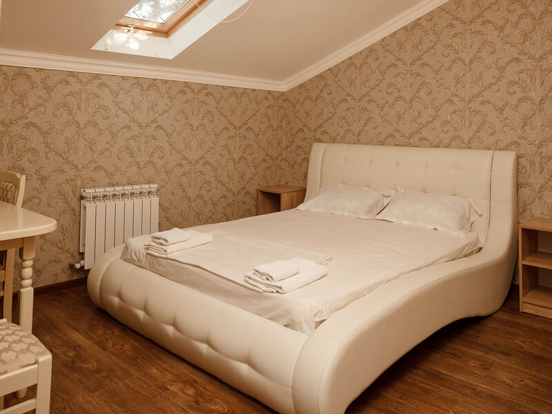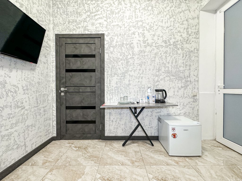 Однокомнатный номер для двоих со всеми необходимыми удобствами. Широкая двуспальная кровать, шкаф с зеркалом в полный рост, стол, стул, кондиционер, плазменный большой телевизор, туалетная комната со своим душем и туалетом. В номере так же есть чайник, холодильник, небольшой набор посуды, фен, сейф. Банные полотенца и косметические средства, ложка для обуви.