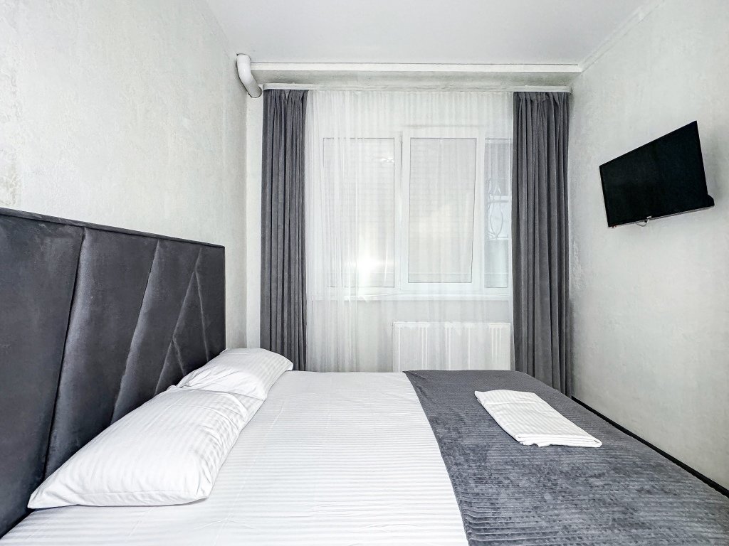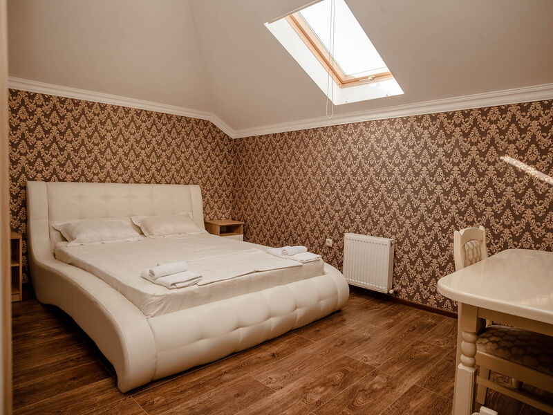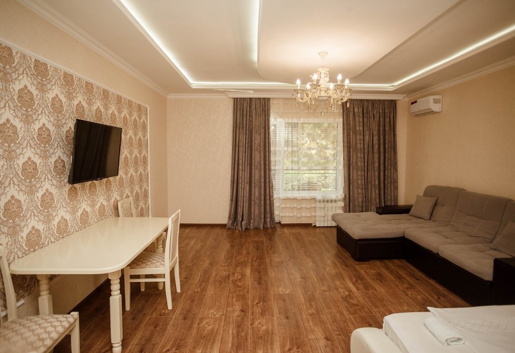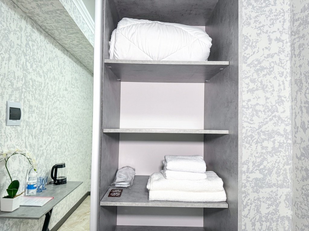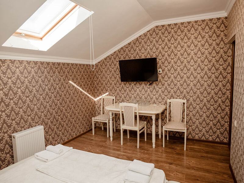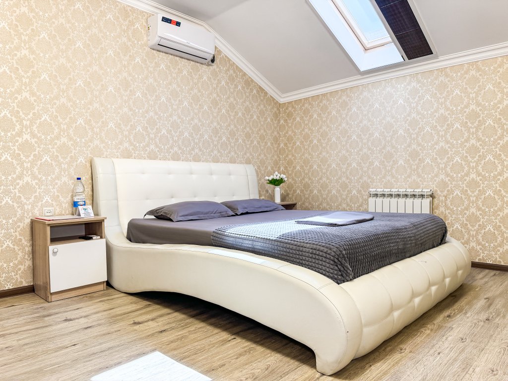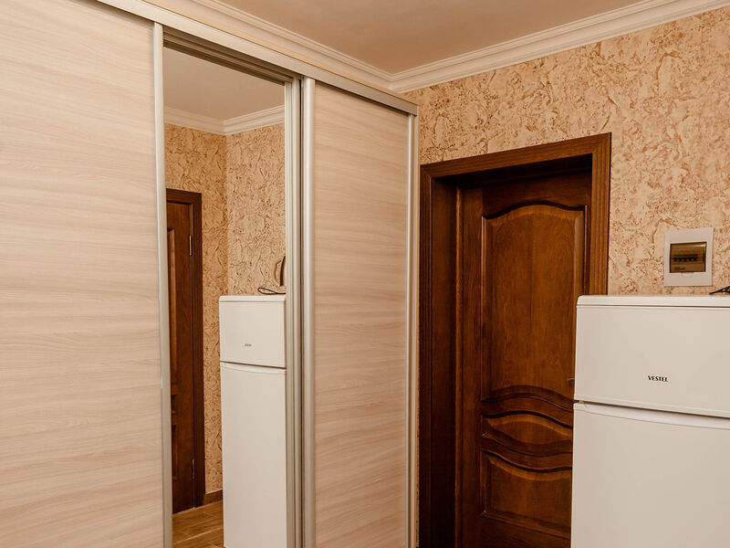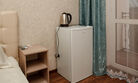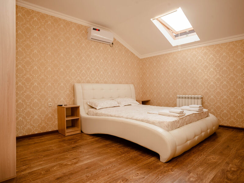 Однокомнатный номер для двоих со всеми необходимыми удобствами. Широкая двуспальная кровать, шкаф с зеркалом в полный рост, стол, стул, кондиционер, плазменный большой телевизор, туалетная комната со своим душем и туалетом. В номере так же есть чайник, холодильник, небольшой набор посуды, фен, сейф. Банные полотенца и косметические средства, ложка для обуви.