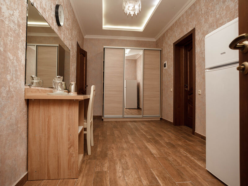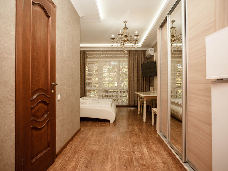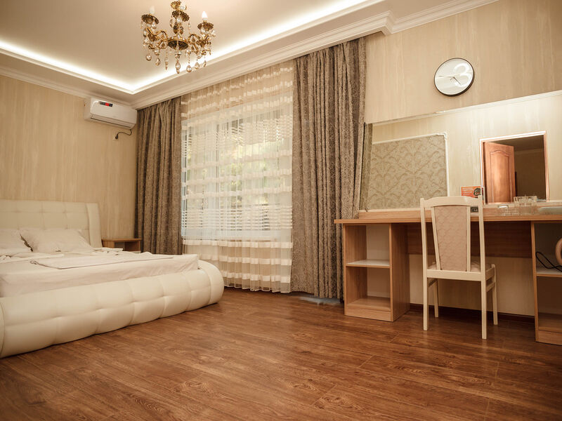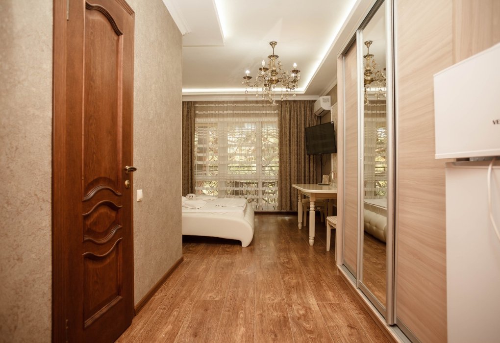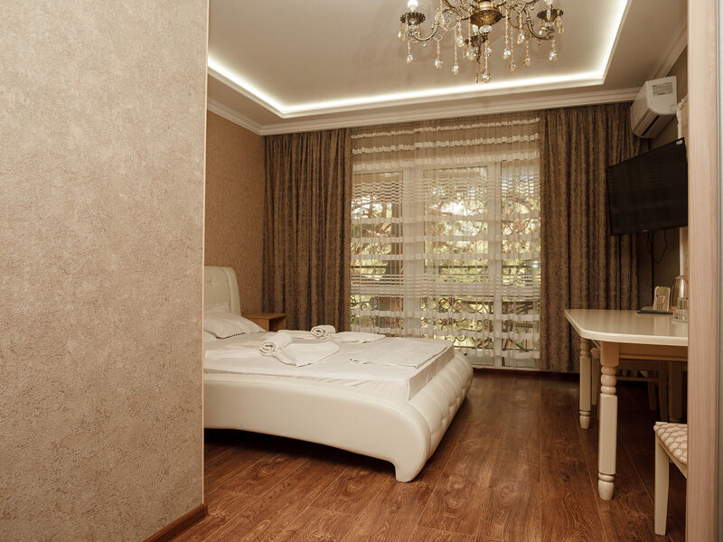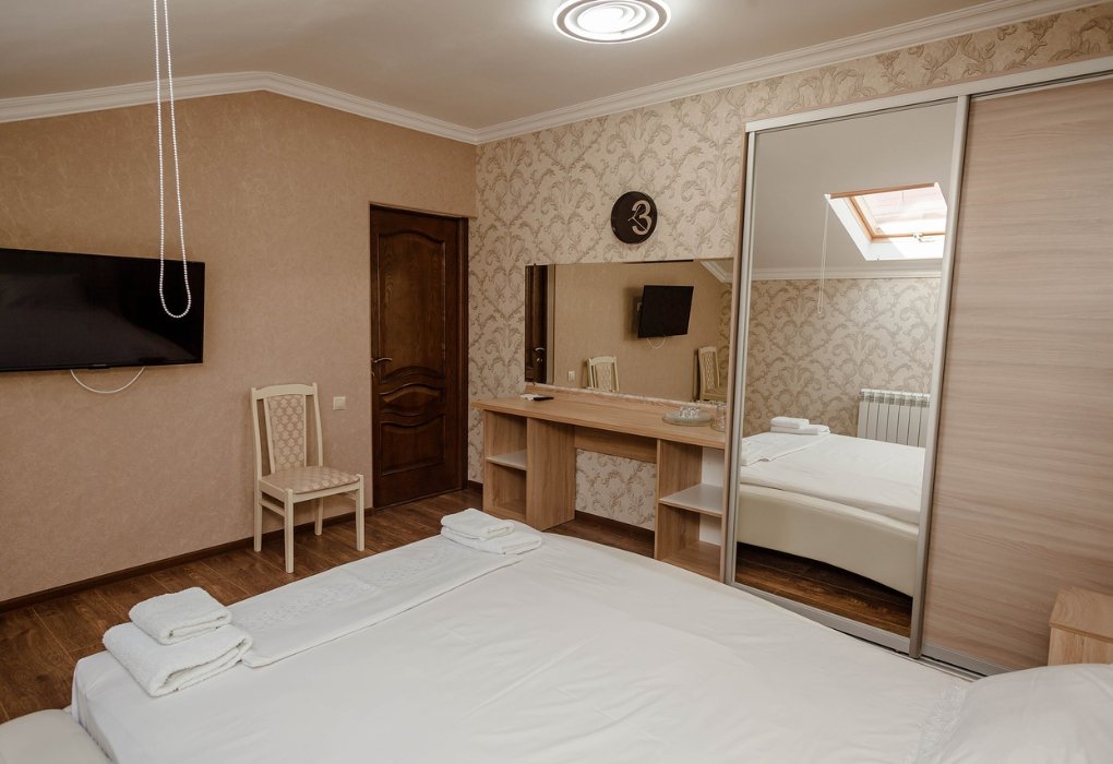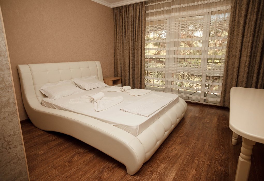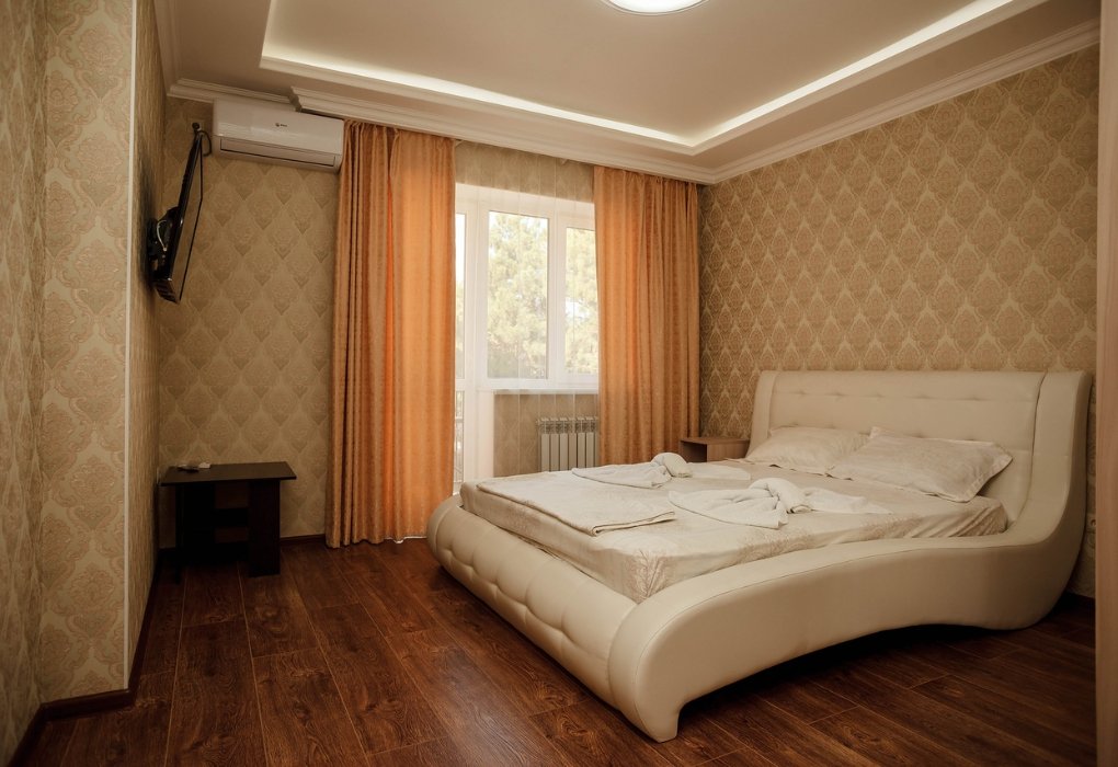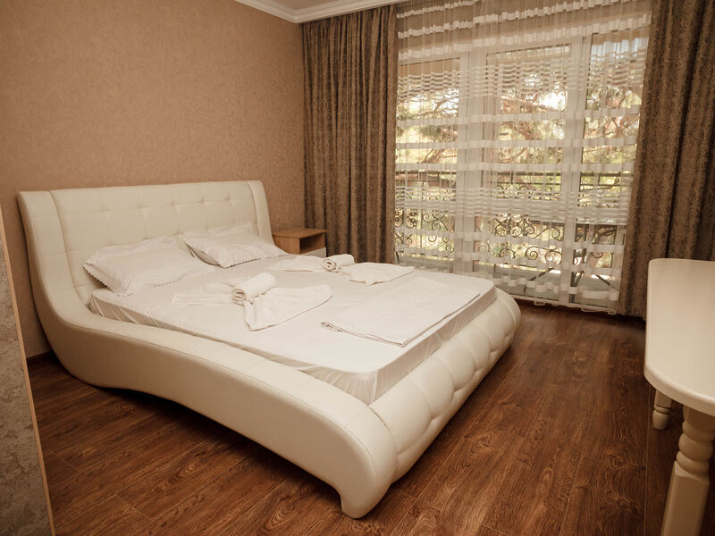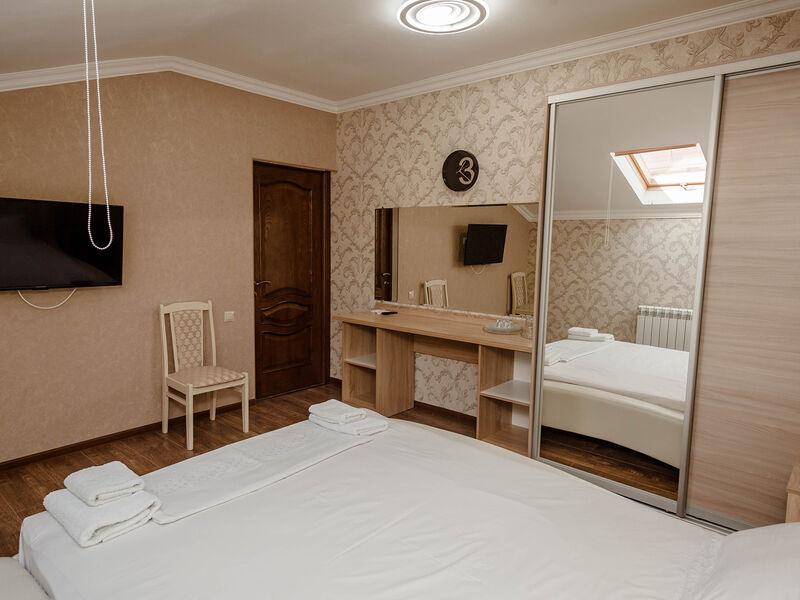 Номер со всеми необходимыми удобствами. Широкая двуспальная кровать, шкаф с зеркалом в полный рост, кондиционер, плазменный большой телевизор, туалетная комната со своим душем и туалетом. В номере так же есть чайник, холодильник, небольшой набор посуды, фен, сейф. Банные полотенца и косметические средства, ложка для обуви. При желании можно добавить доп. место (или детскую кроватку) для одного ребёнка, это будет самый бюджетный вариант, чтобы разместиться небольшой семьей 2+1.