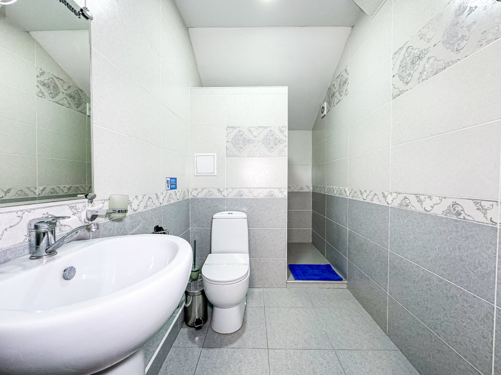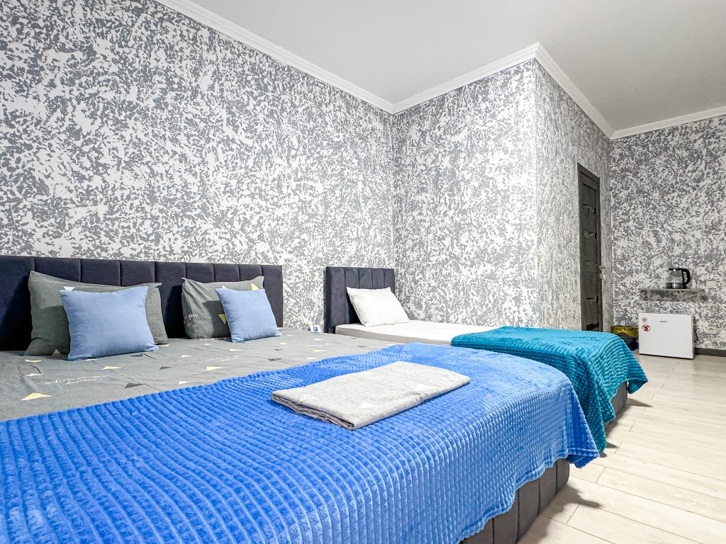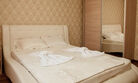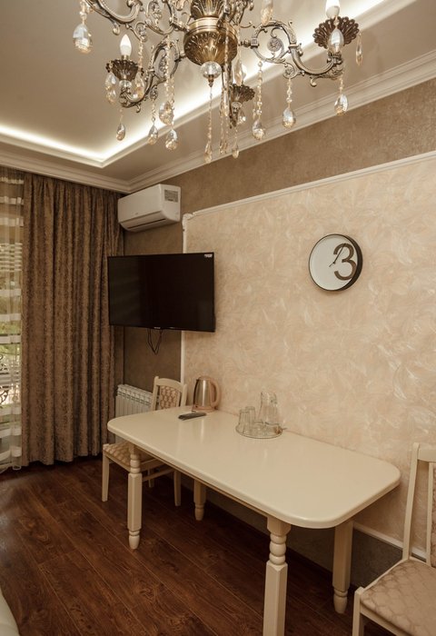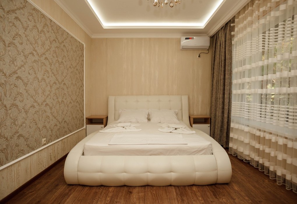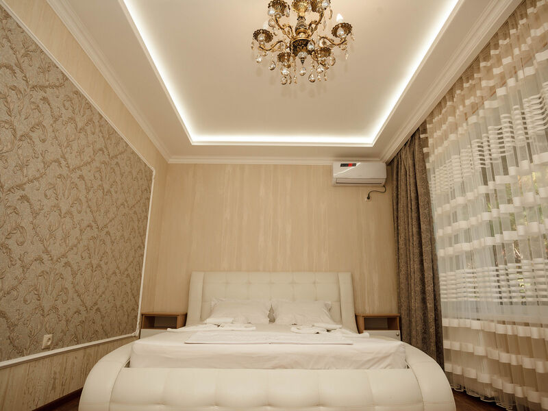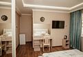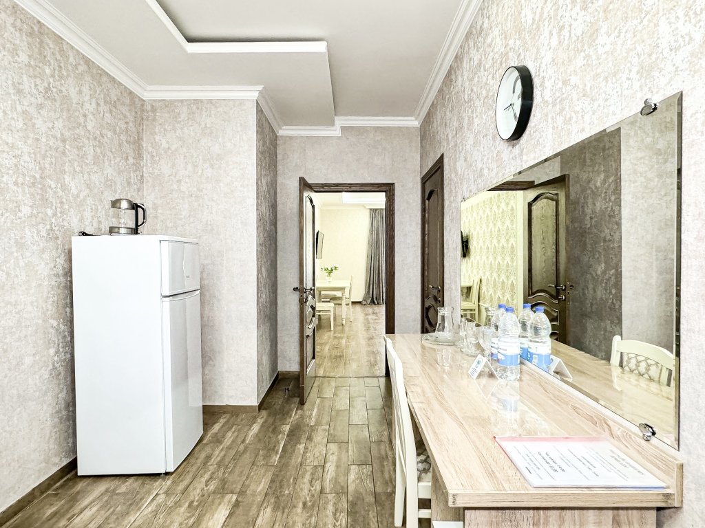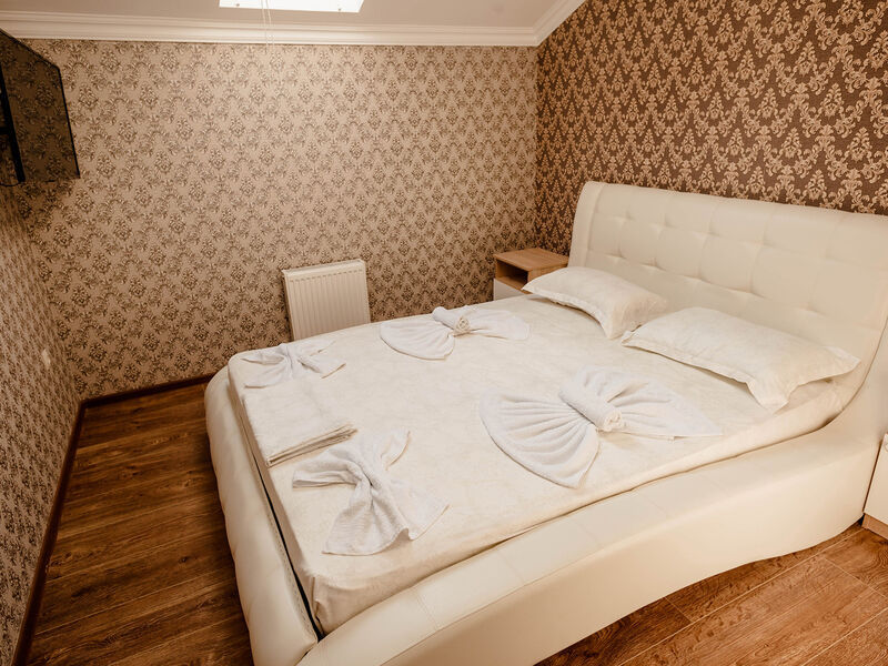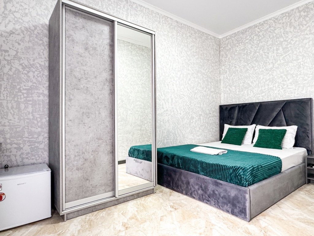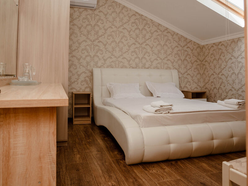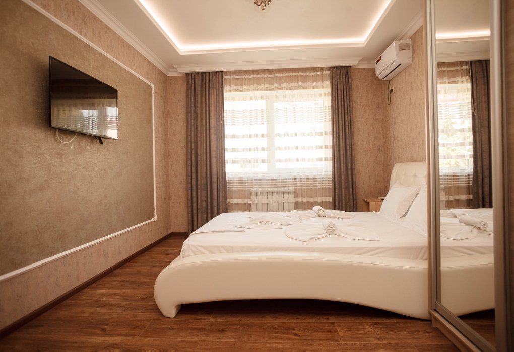 Номер со всеми необходимыми удобствами. Широкая двуспальная кровать, шкаф с зеркалом в полный рост, кондиционер, плазменный большой телевизор, туалетная комната со своим душем и туалетом. В номере так же есть чайник, холодильник, небольшой набор посуды, фен, сейф. Банные полотенца и косметические средства, ложка для обуви. При желании можно добавить доп. место (или детскую кроватку) для одного ребёнка, это будет самый бюджетный вариант, чтобы разместиться небольшой семьей 2+1.