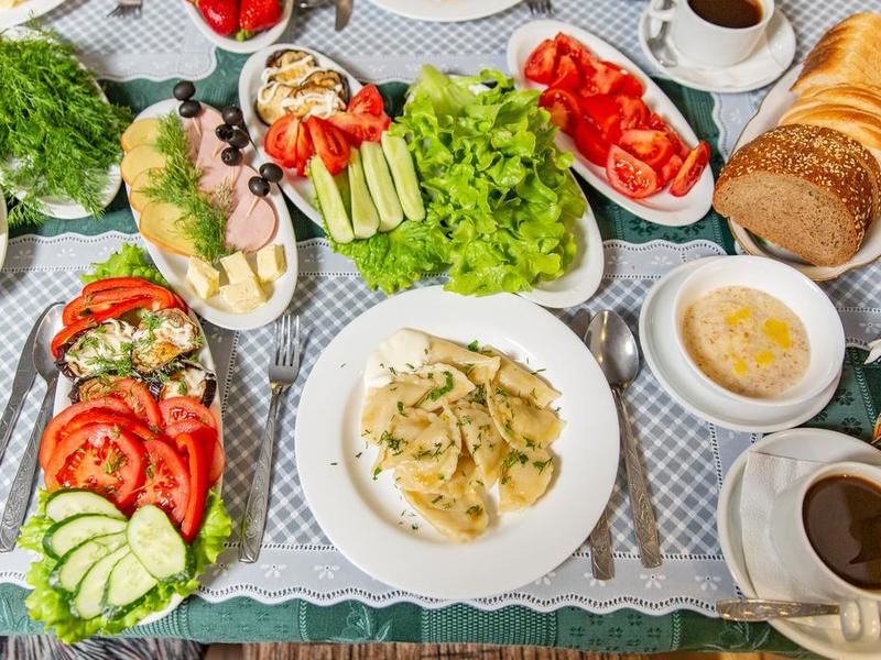 Трехразовое питание по системе заказного меню: блюда Кубанской кухни, первые и вторые блюда, закуски, фруктовые напитки, соки, обилие фруктов, овощей и зелени. -