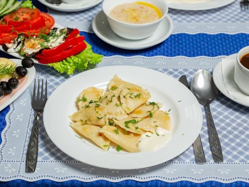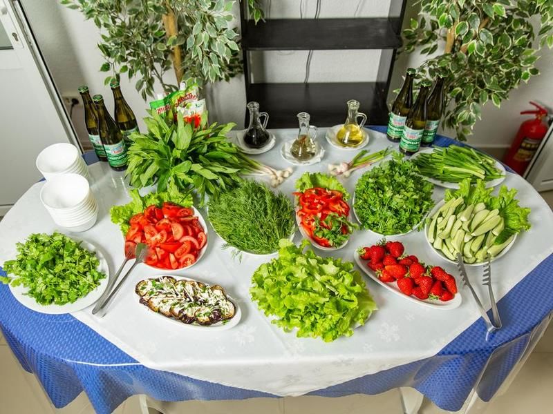 Трехразовое питание по системе заказного меню: блюда Кубанской кухни, первые и вторые блюда, закуски, фруктовые напитки, соки, обилие фруктов, овощей и зелени.Столовая
