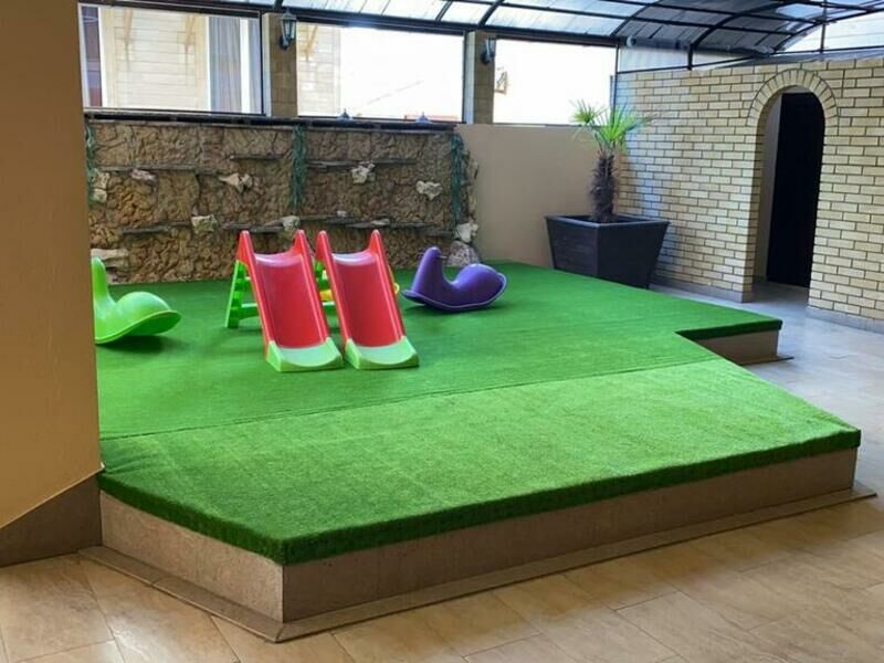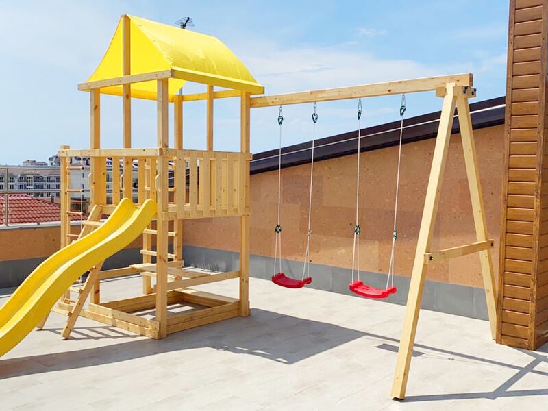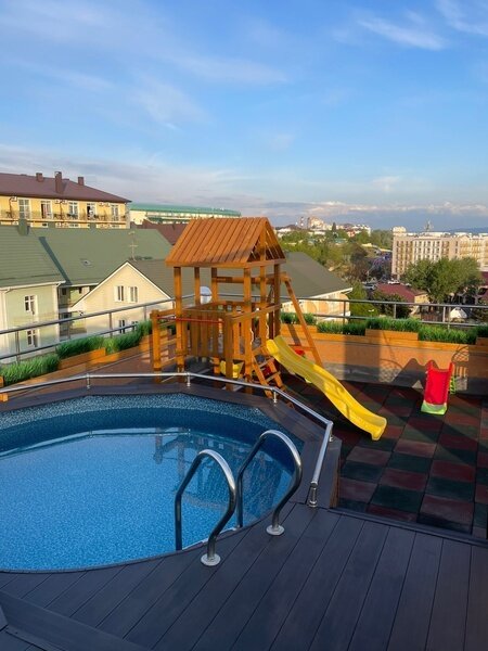 Именно там расположены отдельный детский и взрослый бассейны с подогревом, мини-бар с прохладительными напитками, а также детская территория с качелями и горкой.