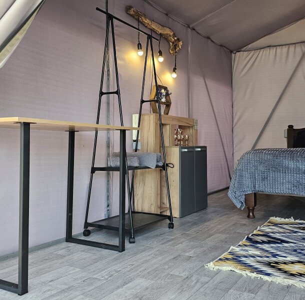 Также вы можете разместиться в одном из сафари-тентов, для гостей которорых предусмотрена специальная зона душевых и уборных, расположенная поблизости.