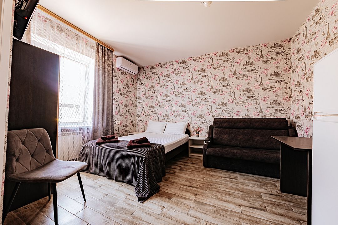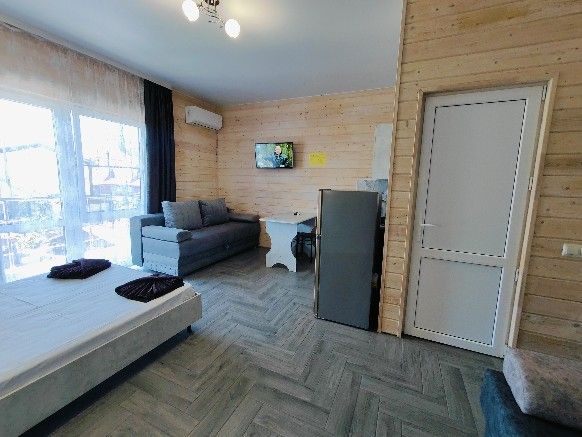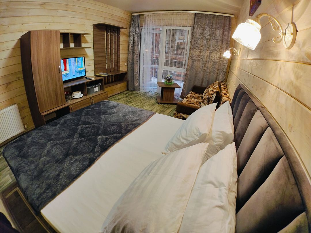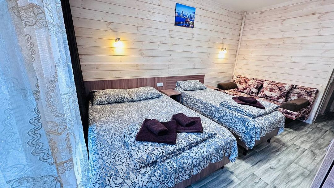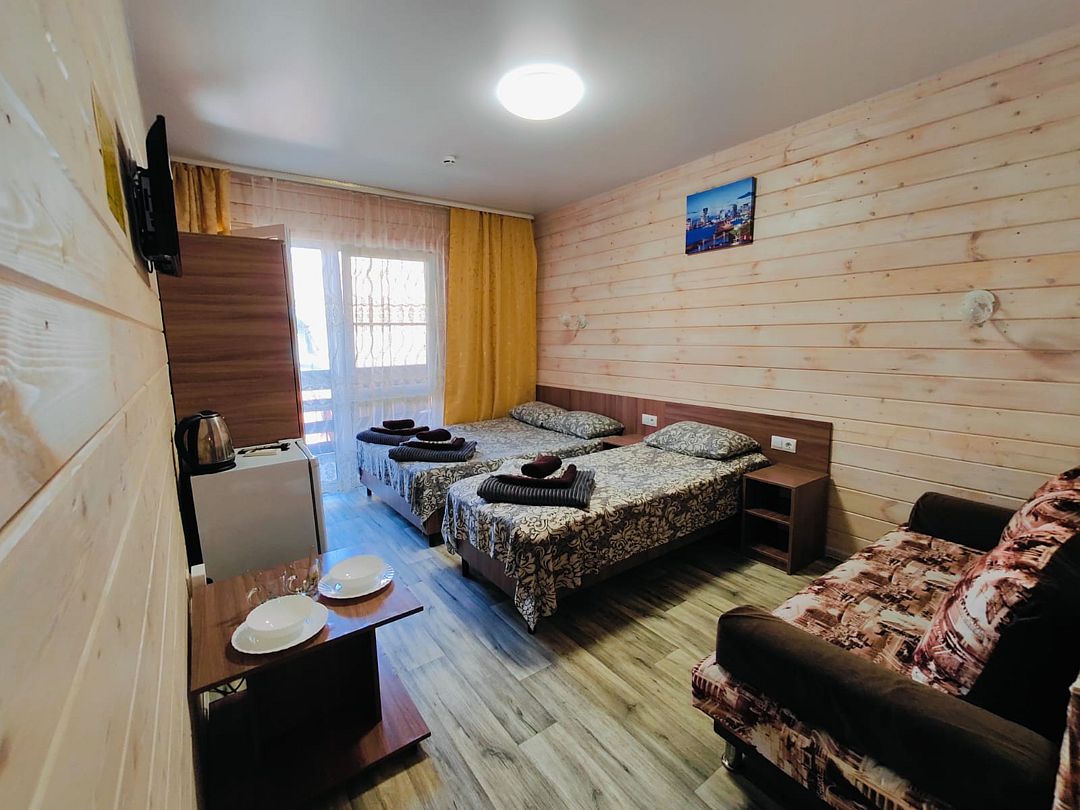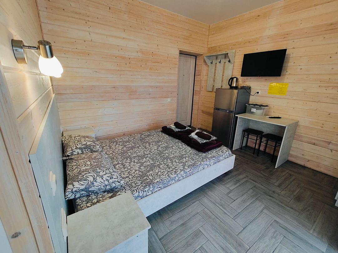 В номере есть все необходимое: двуспальная кровать 1,4 м и диван-кровать 1.4 м, шкаф, прикроватная тумба, письменный стол, TV, холодильник, сплит-система, фен, чайник, набор посуды, набор полотенец, совмещённый санузел и косметика для ванны. В стоимость номера включено: бассейн с подогревом 4х8 с детской зоной, шезлонги, зона барбекю и столики, детская площадка, анимация для детей — летом, Wi-Fi, кухни для самостоятельного приготовления.