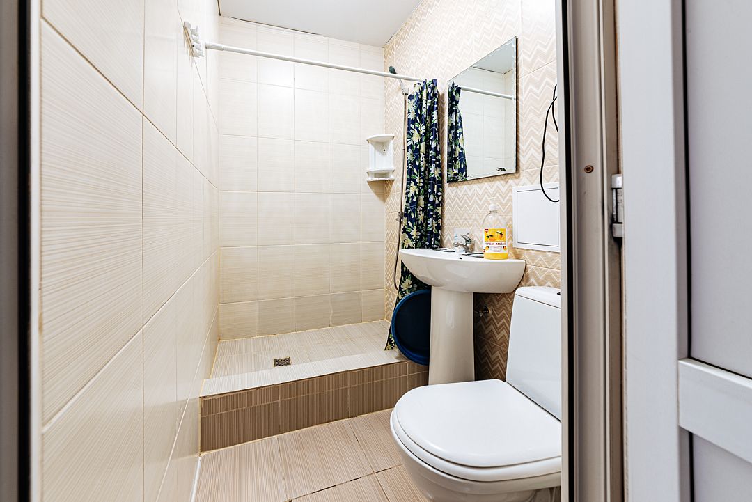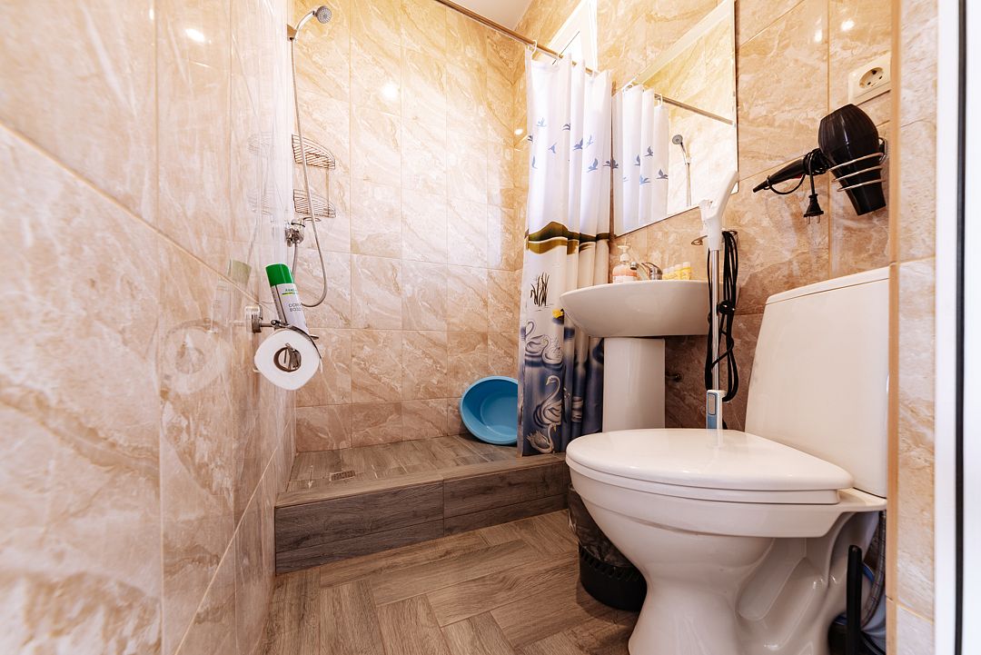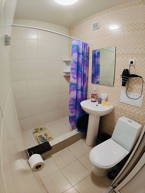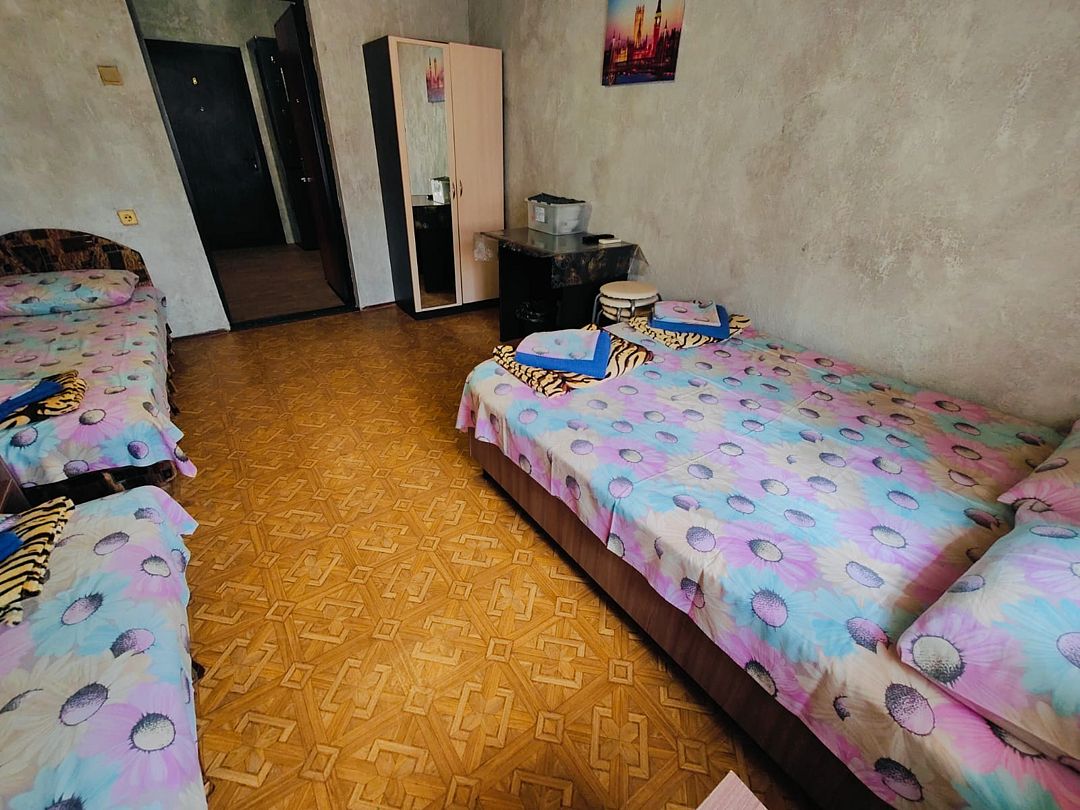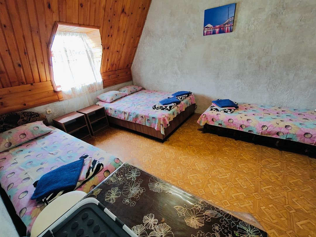 Уютный однокомнатный номер для 3-4 гостей, площадью 16 кв. м на 2 мансардном этаже, вход по коридору, где расположены холодильники, гладильная доска, 2 душа и 2 туалета общего пользования, общий балкон и кухня для самостоятельного приготовления.