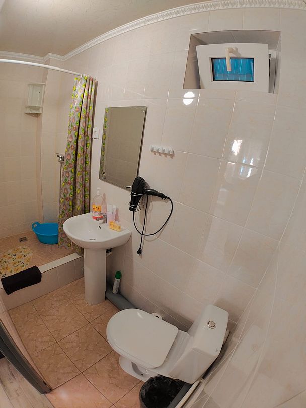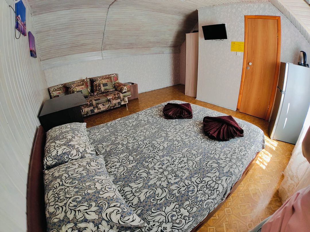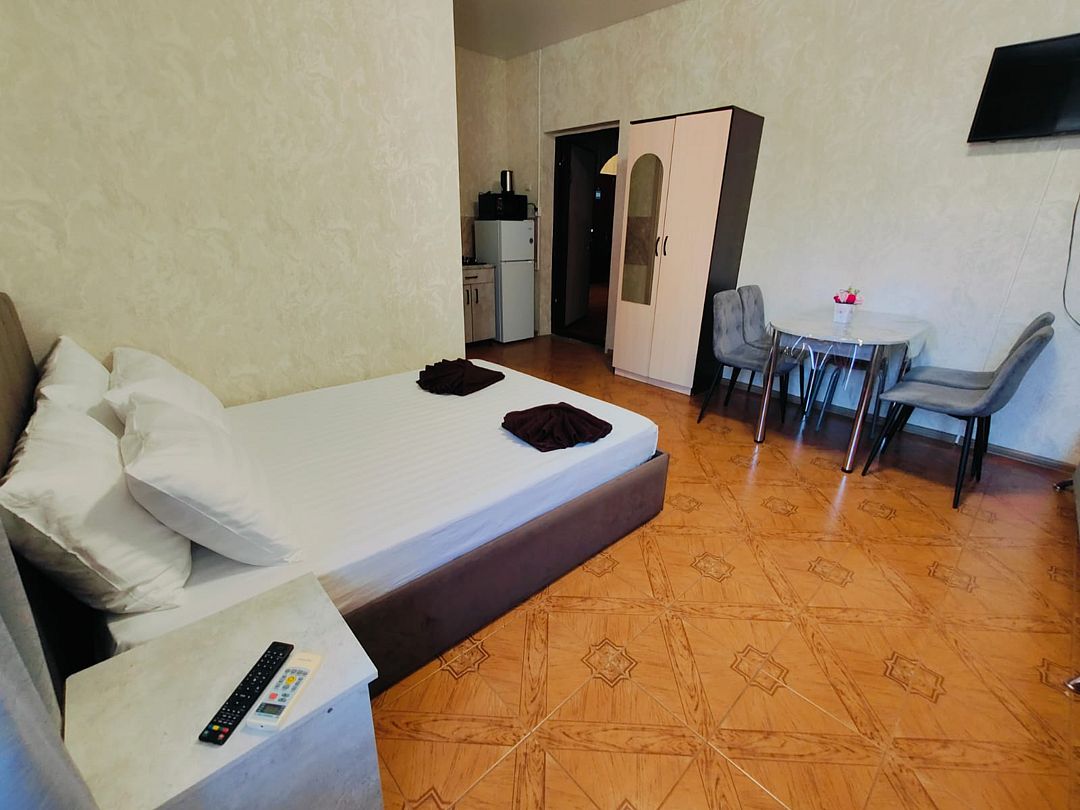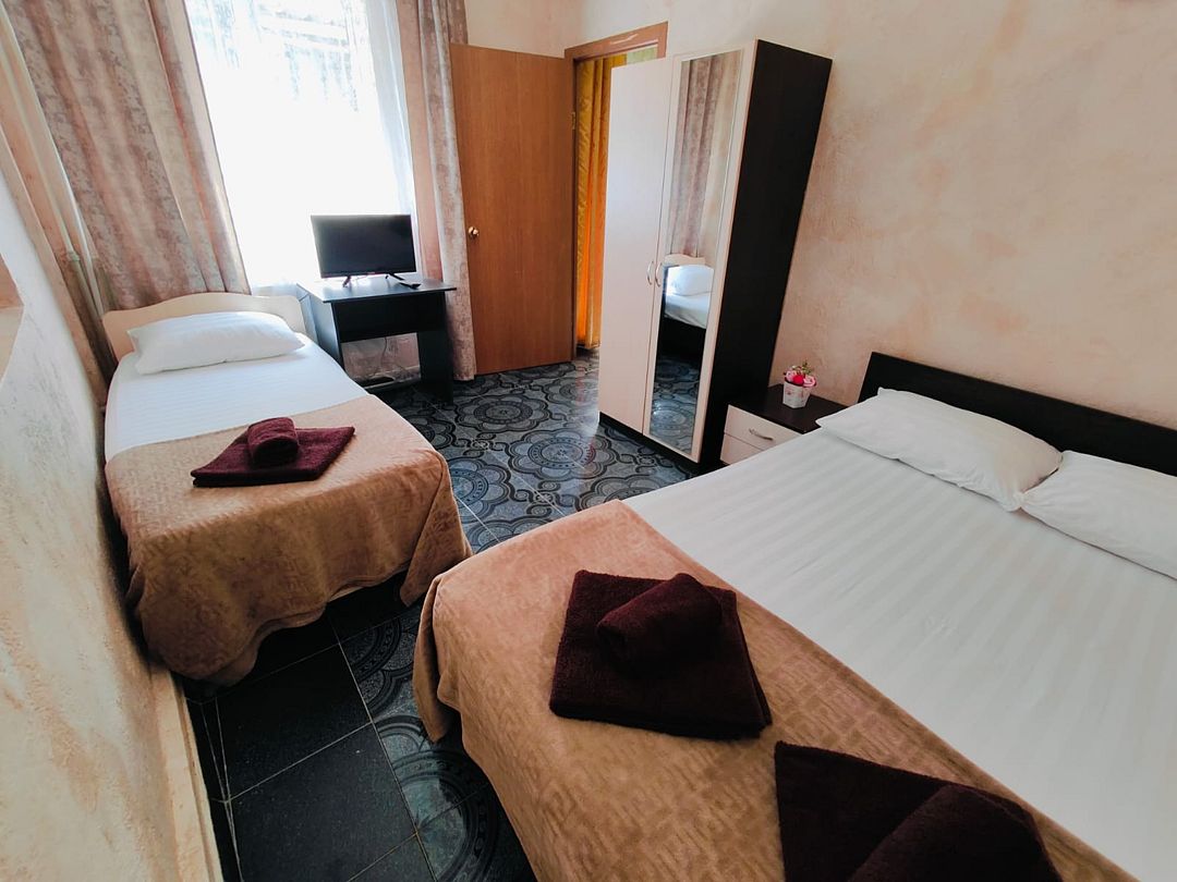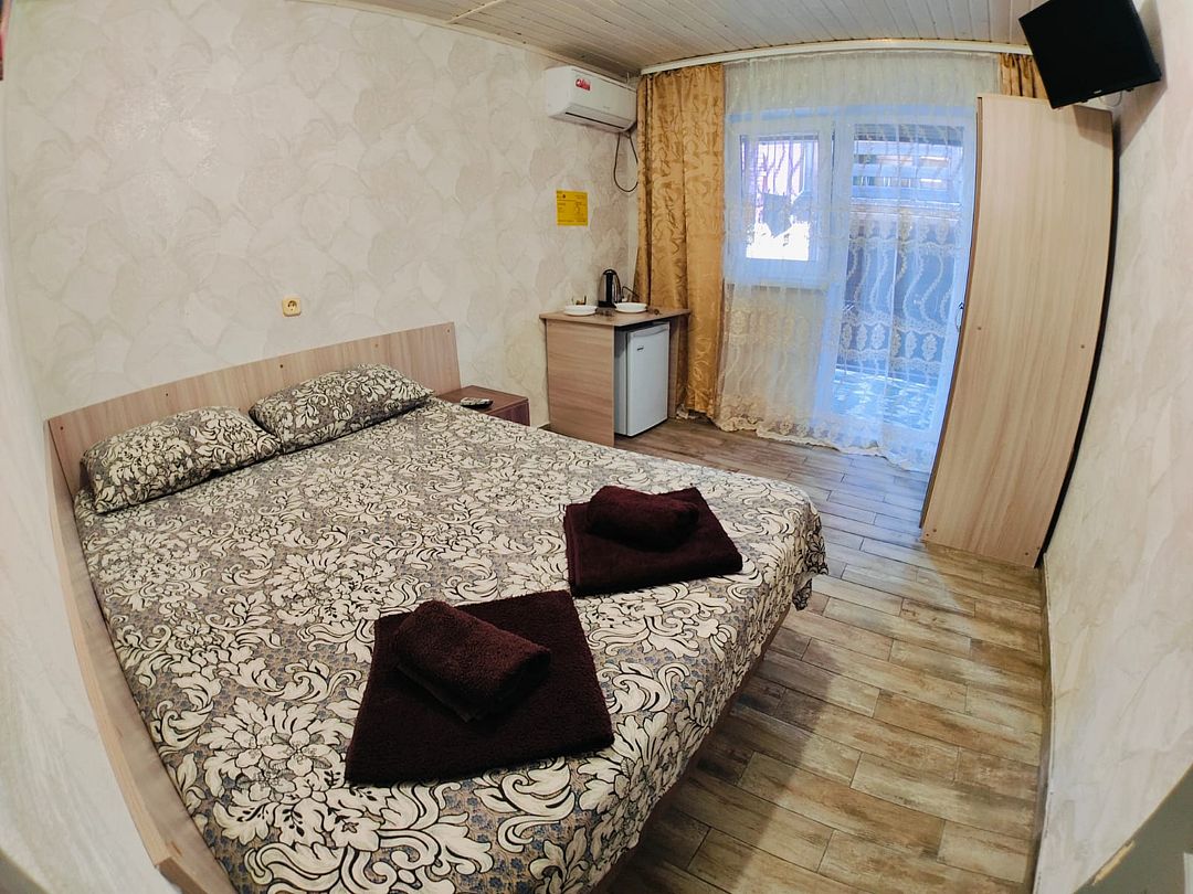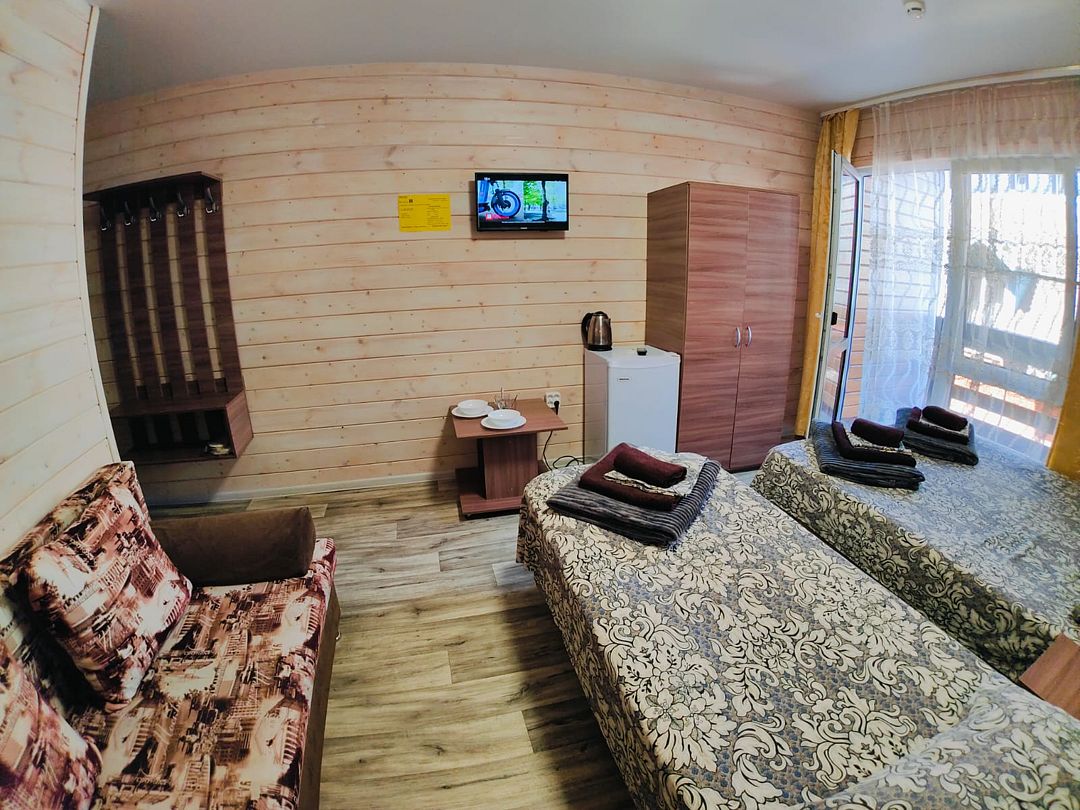 В номере есть все необходимое: односпальная кровать, вешалка, трельяж, TV, сплит-система, набор посуды, набор полотенец, совмещённый санузел рядом в коридоре для 3 гостей. В стоимость номера включено: бассейн с подогревом 4х8 с детской зоной, шезлонги, зона барбекю и столики, детская площадка, анимация для детей — летом, Wi-Fi, кухни для самостоятельного приготовления.